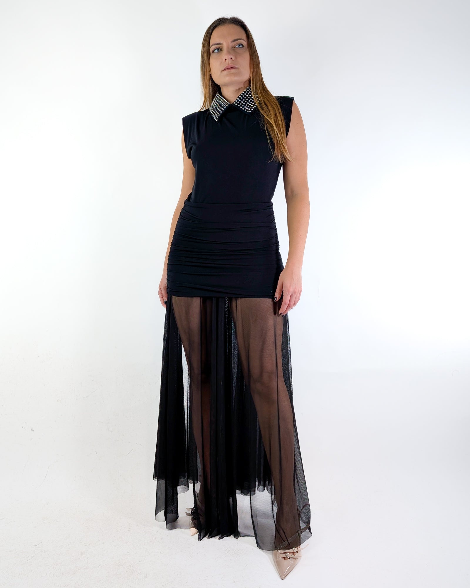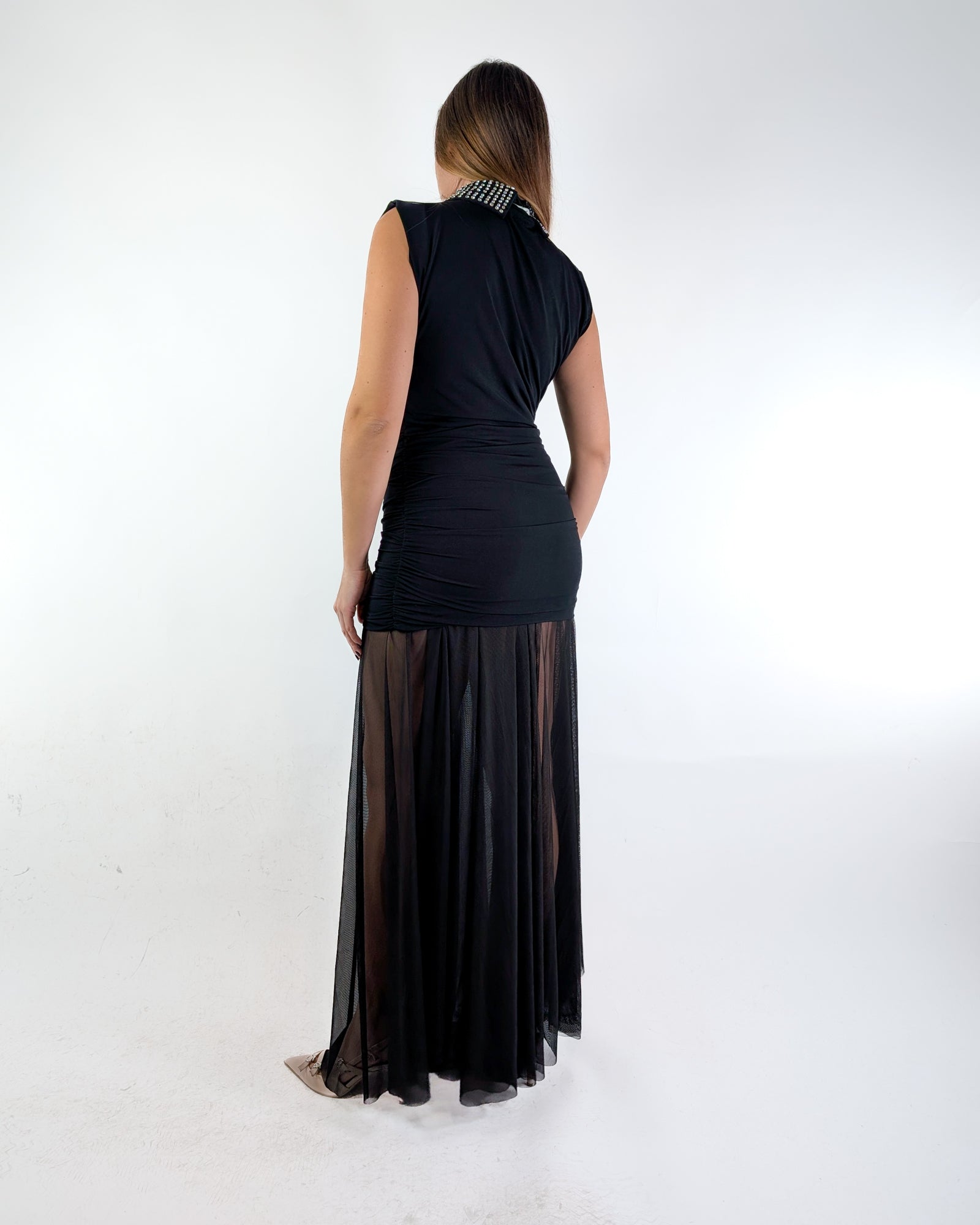 Abito con colletto strass removibile.