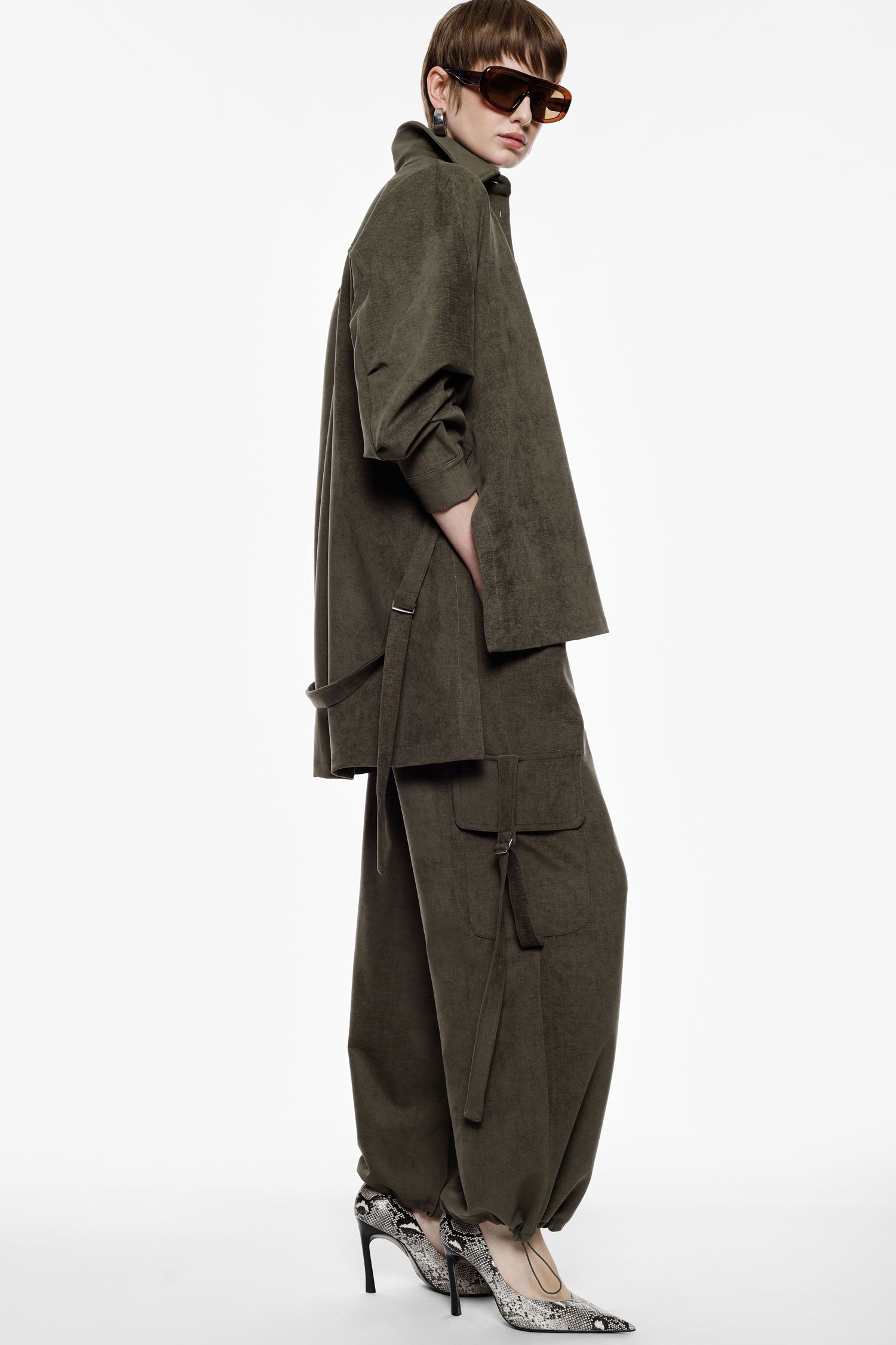 Interpretazione contemporanea dei pantaloni palazzo, caratterizzati da vestibilità ampia, cinture laterali regolabili e tasche cargo con patta. Linee pulite e silhouette rilassata permettono abbinamenti versatili per comporre look urbani e sofisticati, ideali per chi ricerca soluzioni distintive all’interno di un guardaroba metropolitano.