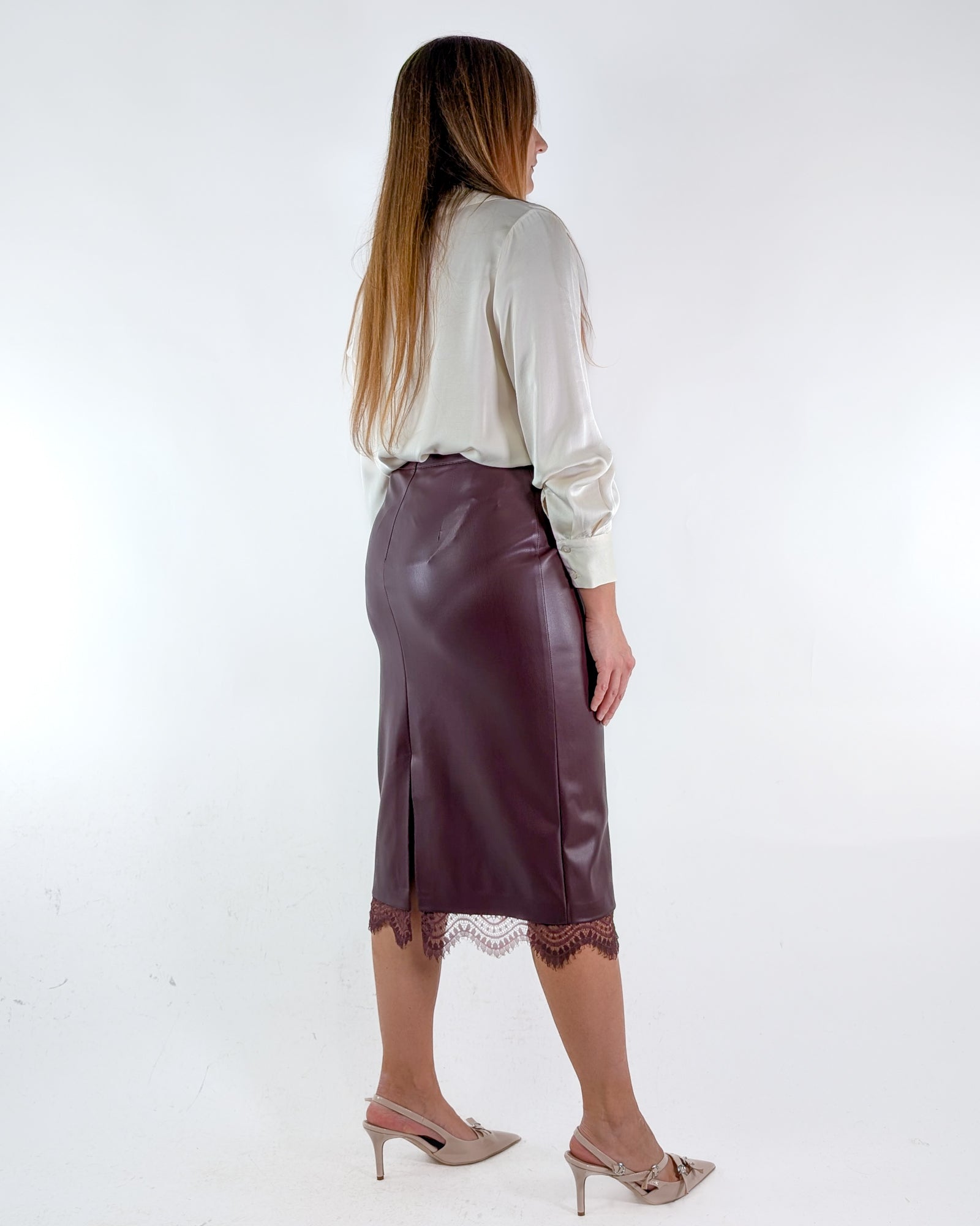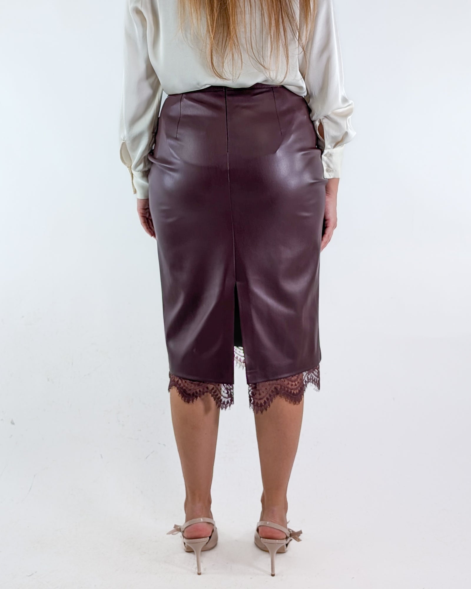 Gonna in ecopelle con orlo in pizzo.