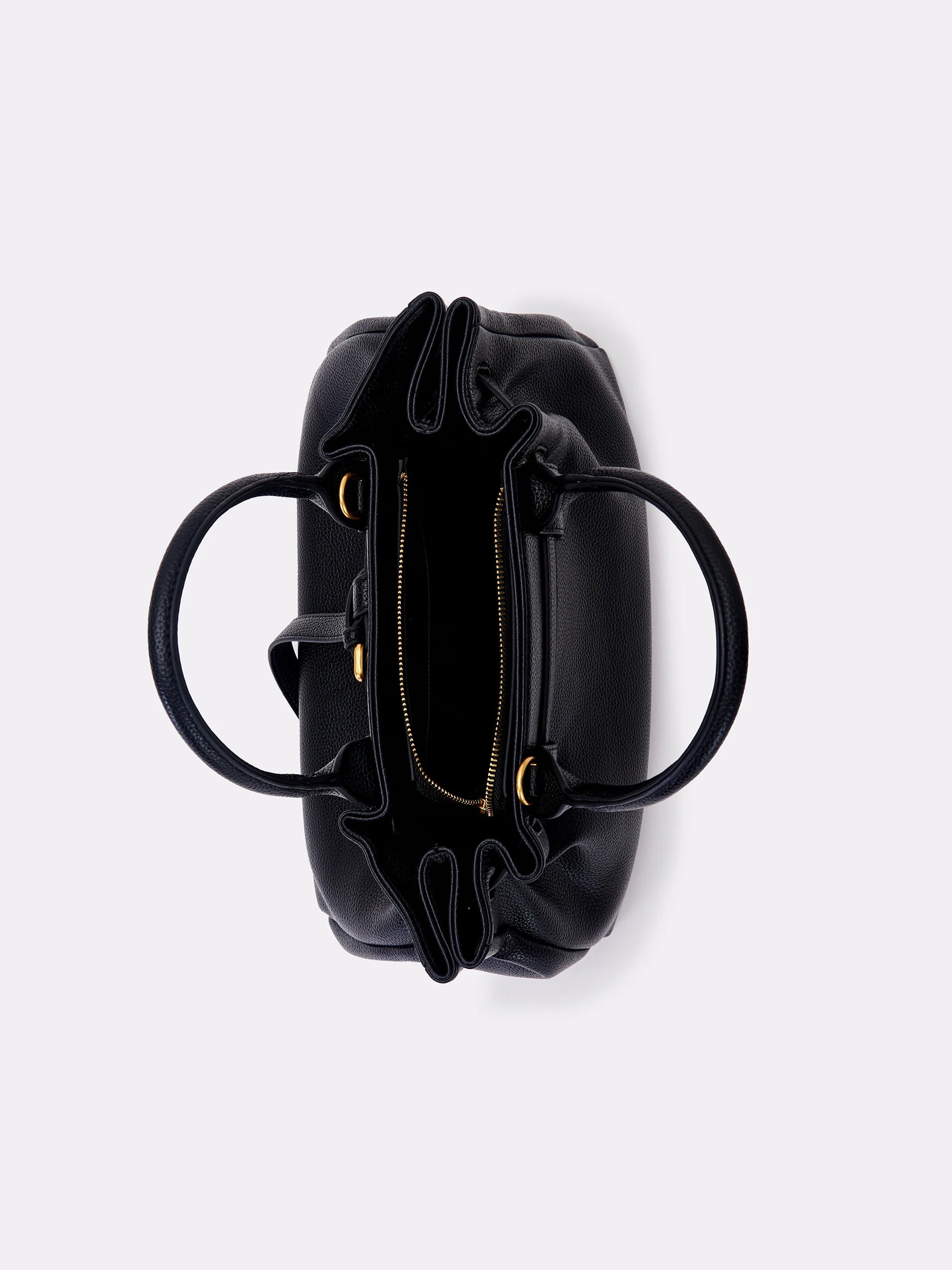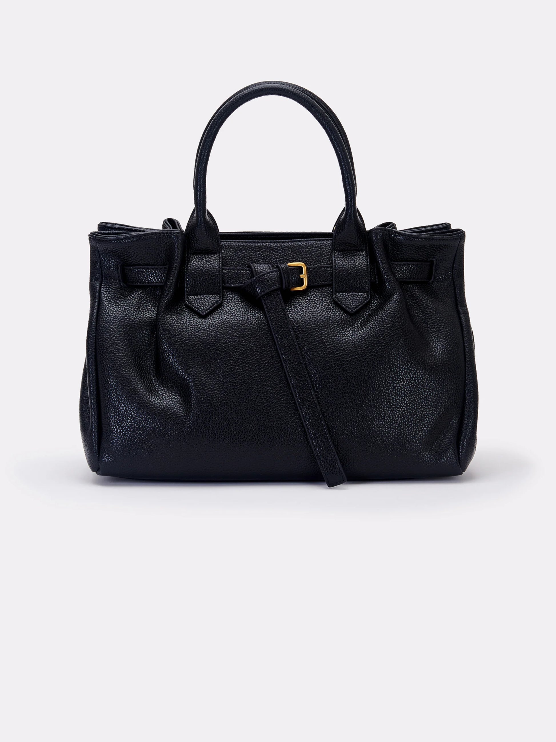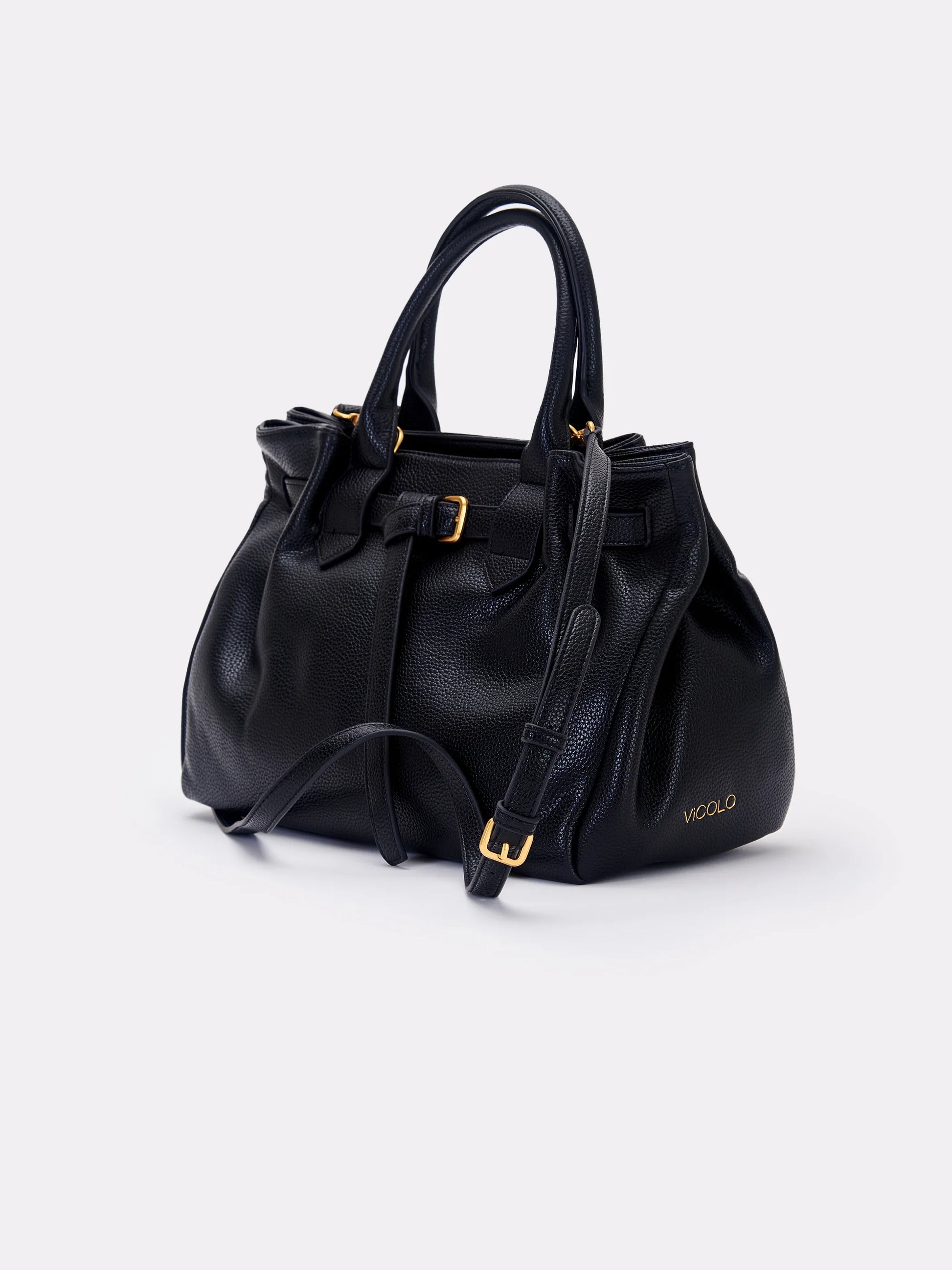 Borsa Journey Bag Small in ecopelle martellata. Manici rigidi in similpelle. Chiusura con cerniera. Dettaglio cintura passante con fibbia con chiusura regolabile. Finiture anticate color oro. Tracolla in similpelle con fibbia regolabile con gancio in metallo removibile. Tasca interna con cerniera e taschina piatta. Logo vicolo lettering impresso a caldo sul lato borsa.