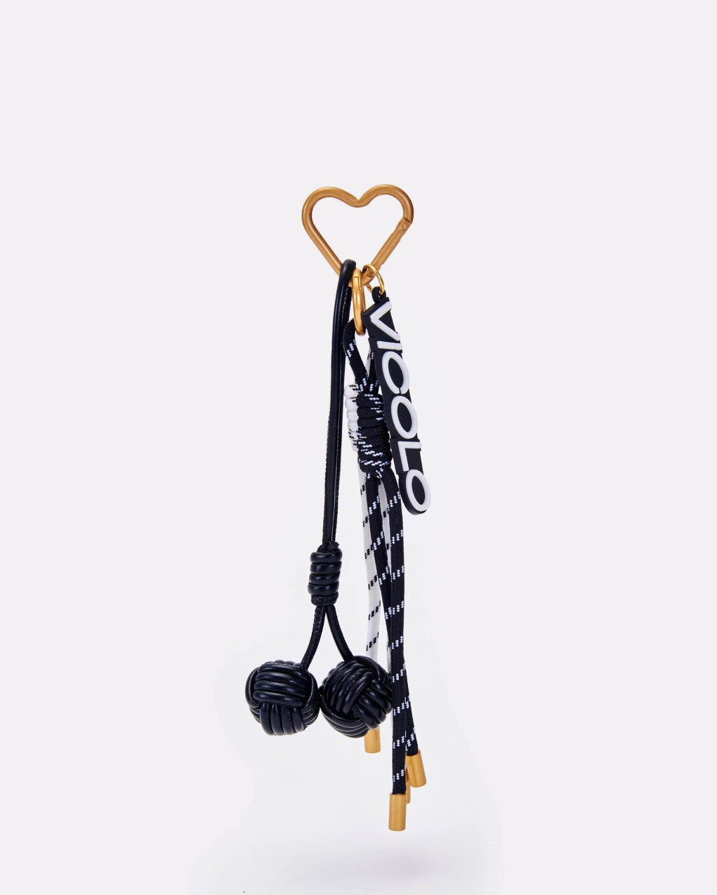 Charm con pendente in similpelle intrecciata, doppio cordino con cappuccio in metallo e charm Vicolo in gomma. Moschettone in metallo. Altezza 22 cm.
