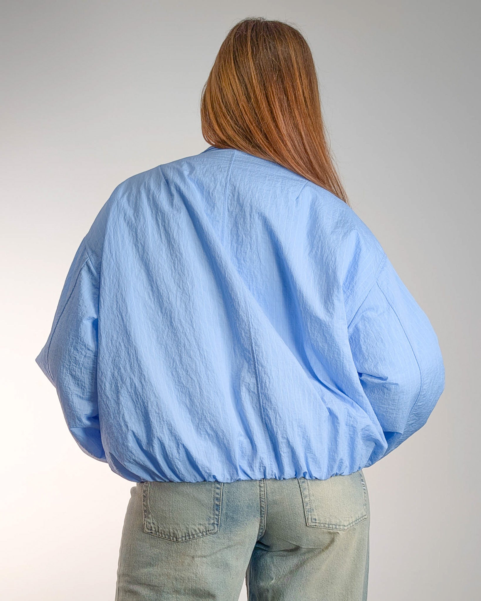 Giacca bomber leggera in tessuto tecnico dall’effetto stropicciato. Collo alla coreana, zip con cordino intrecciato e tasche laterali a filetto. Il dettaglio distintivo è la patch ricamata sul petto, che dona un tocco sportivo e ironico. Perfetta da indossare in primavera o nelle serate più fresche per un look urban e rilassato.