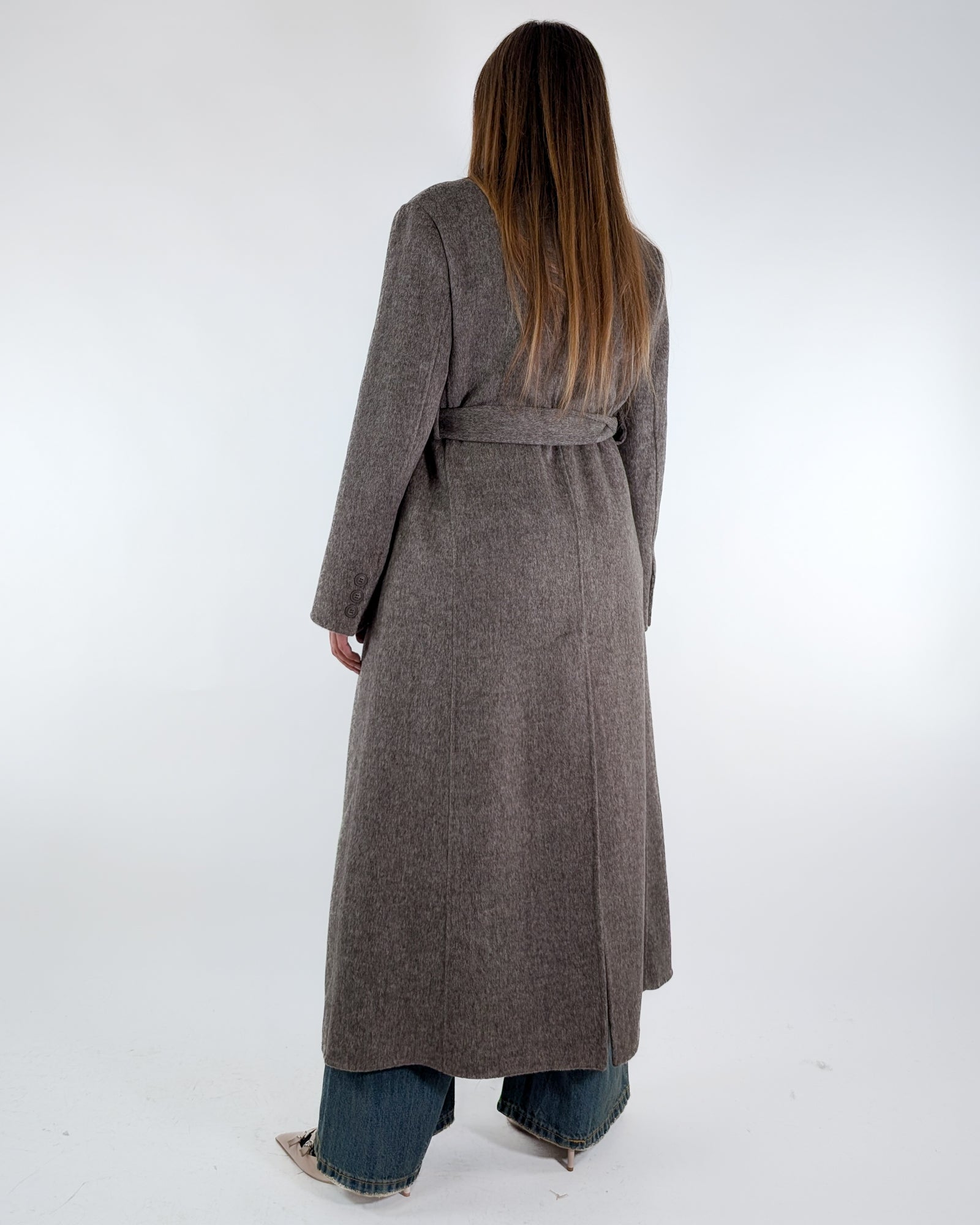 Cappotto doppiopetto lungo con cintura.