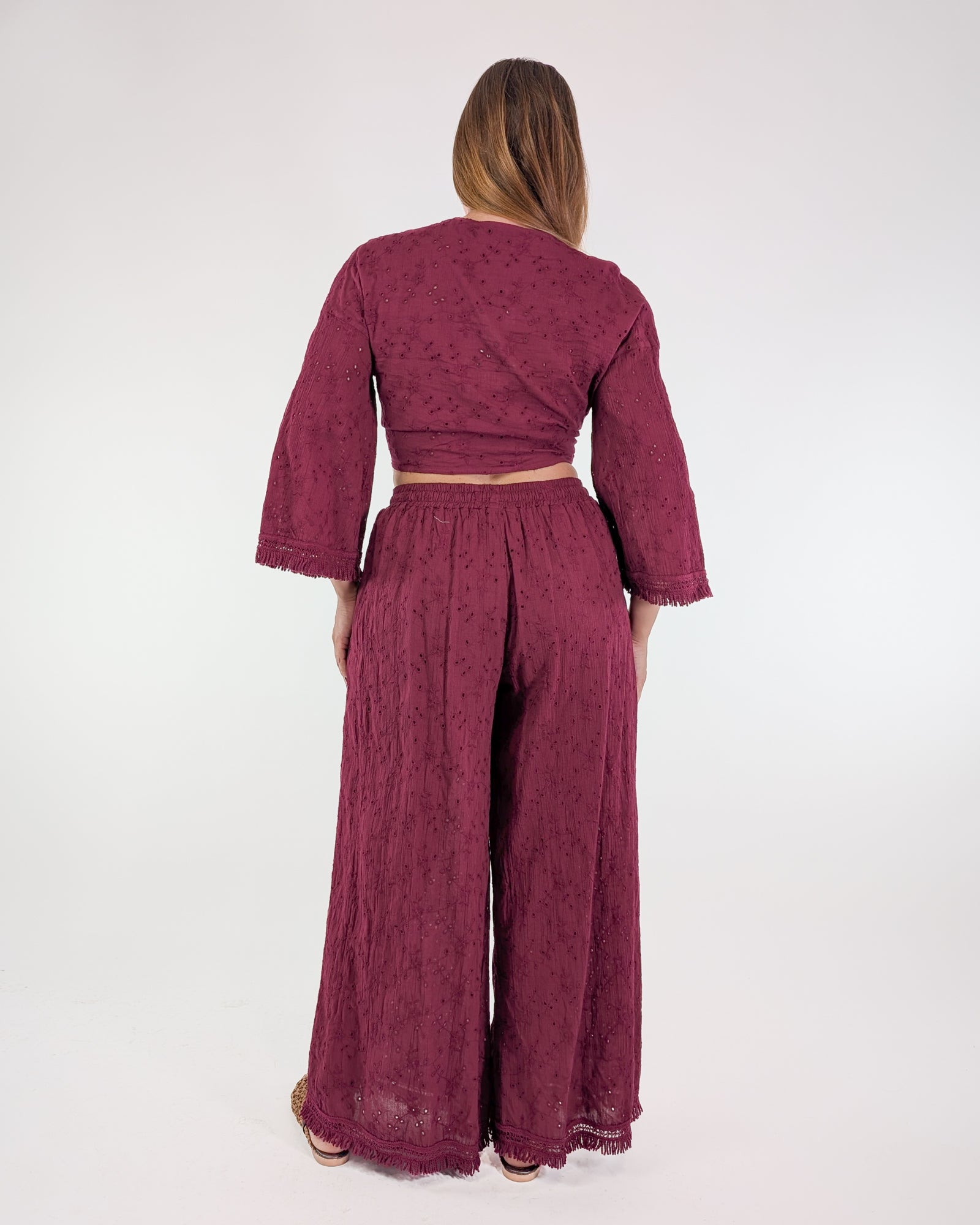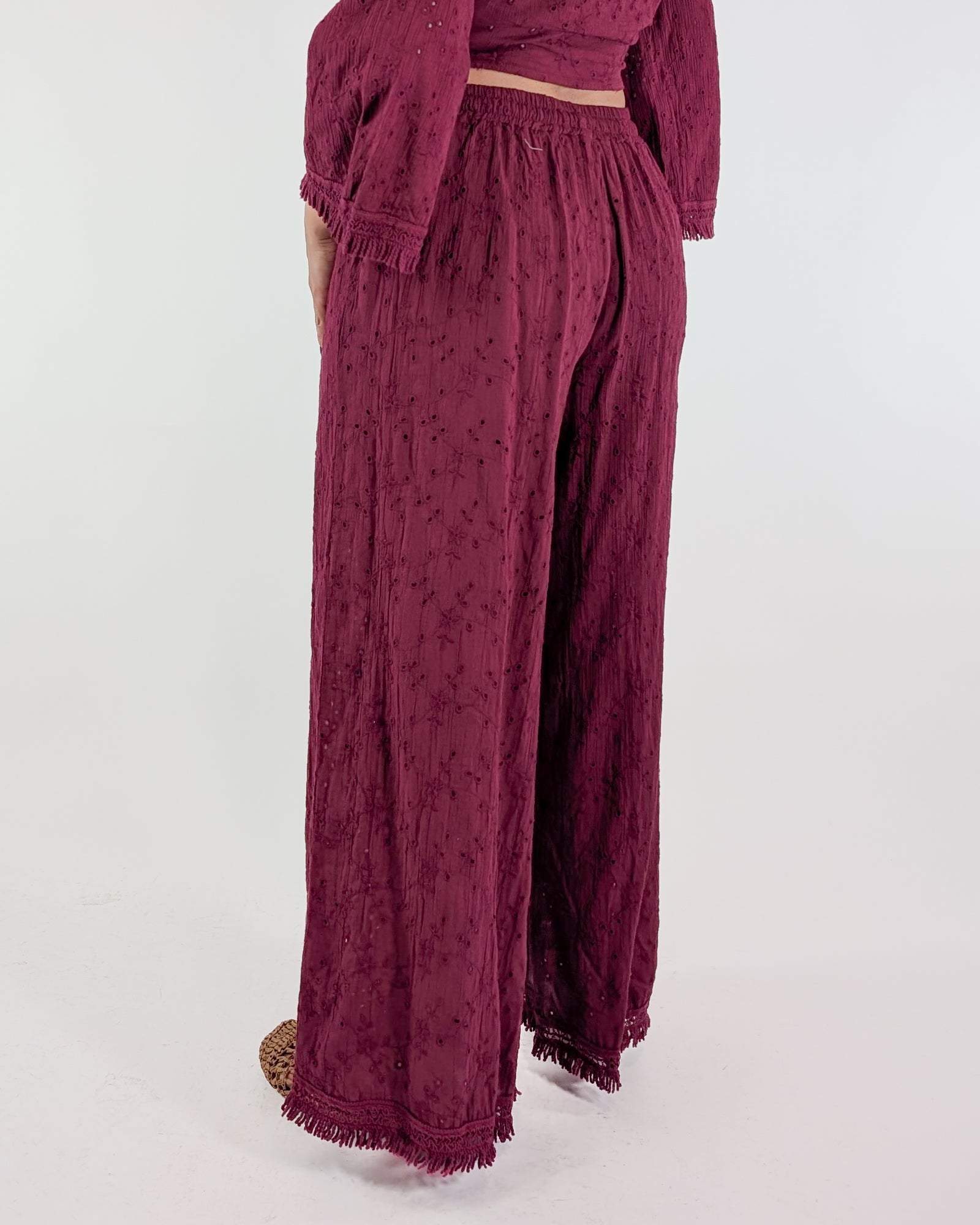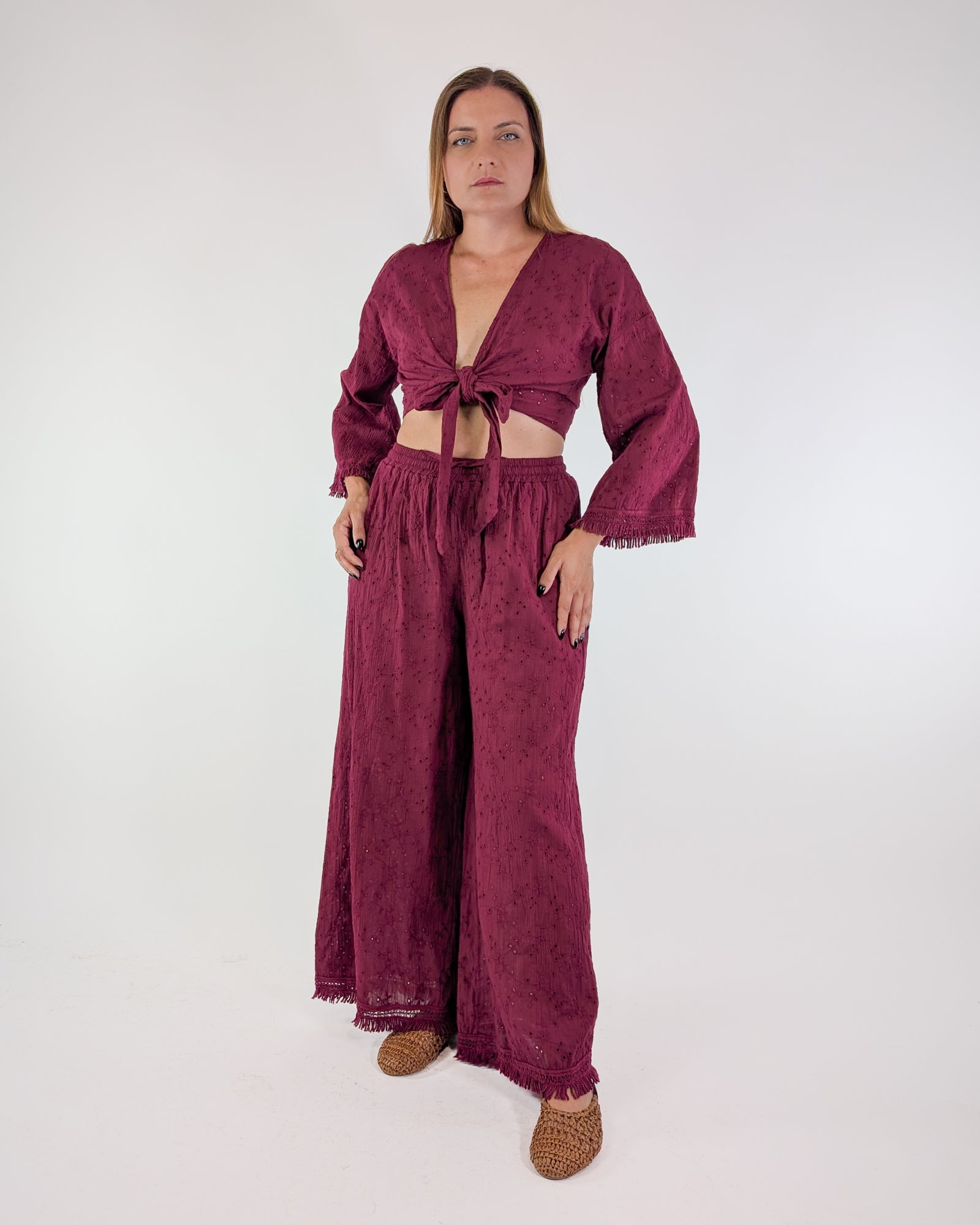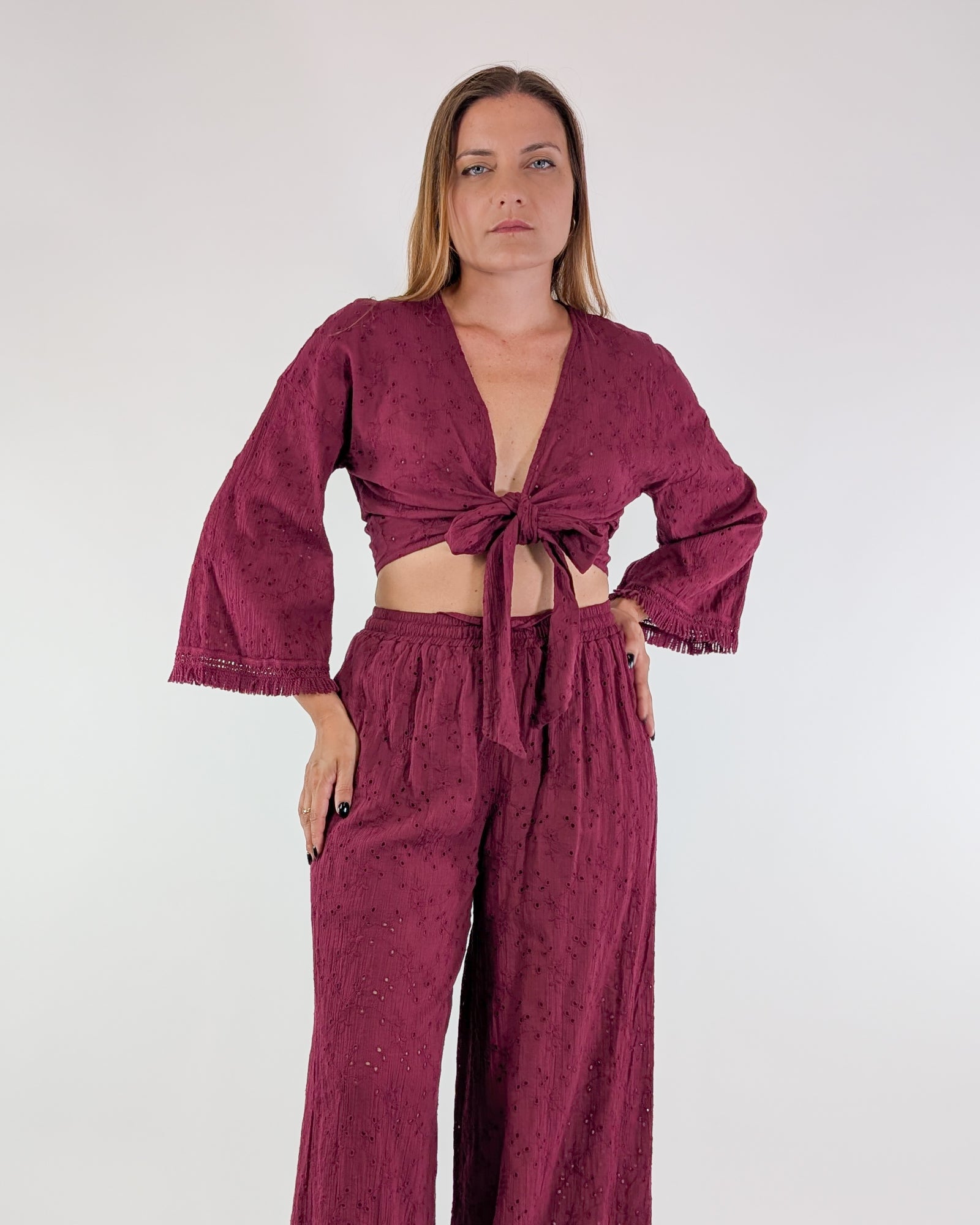 Completo in pizzo sangallo composto da camicia con maniche svasate con frange e pantalone palazzo con coulisse.