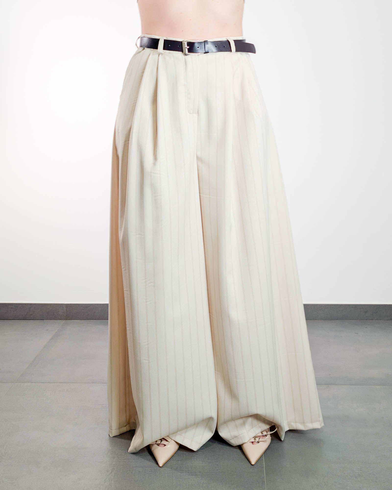 Haveone pantalone palazzo gessato con pieghe e cintura.