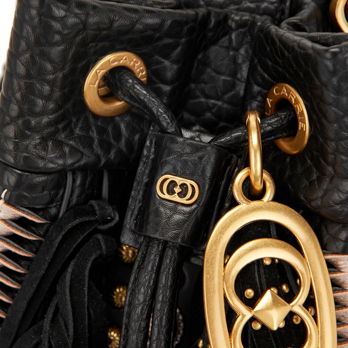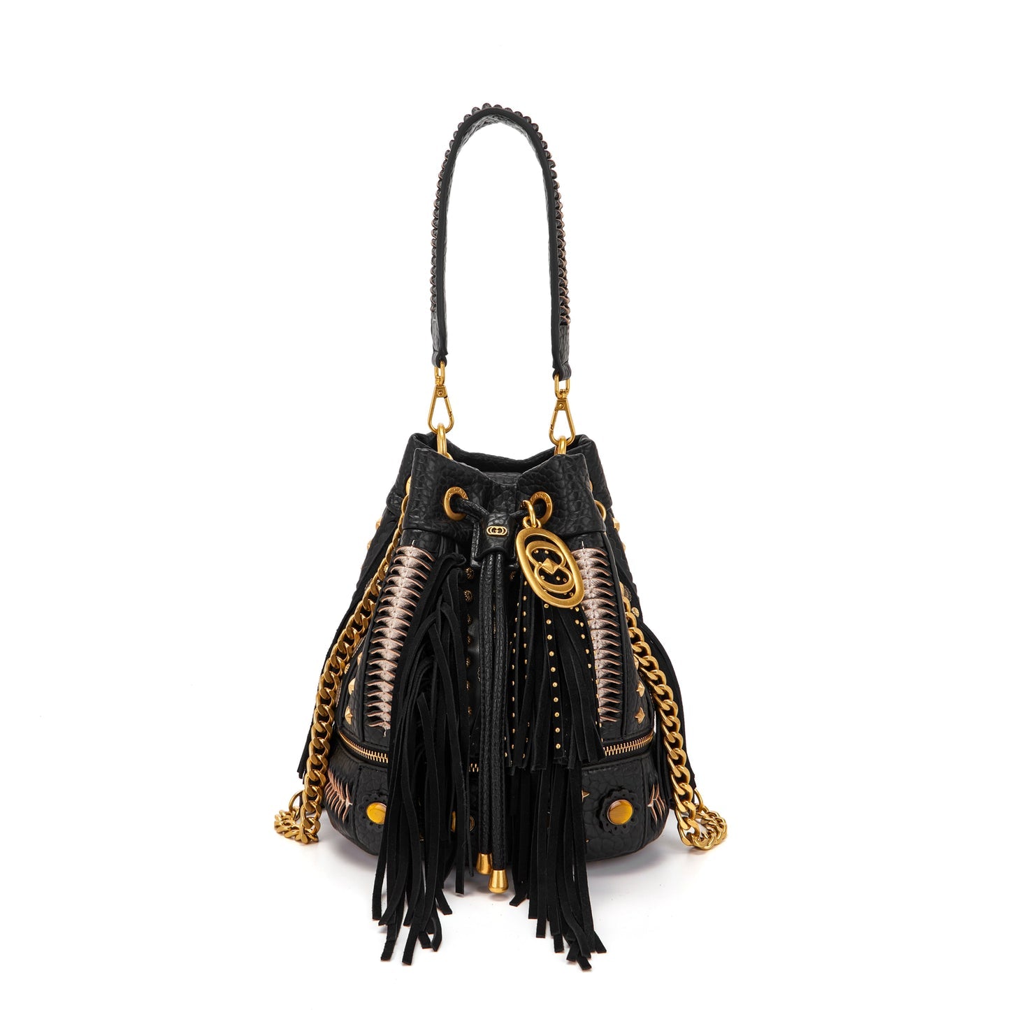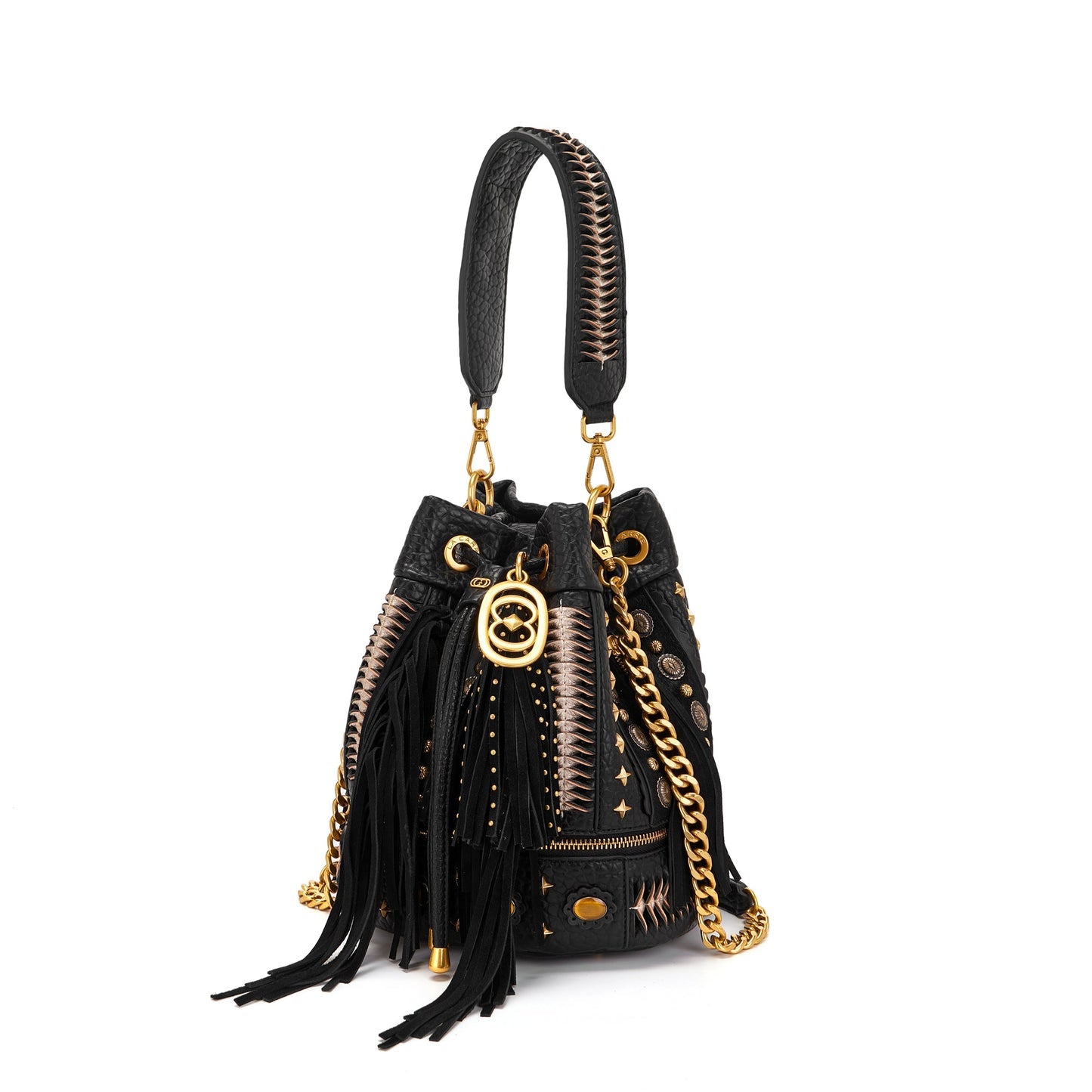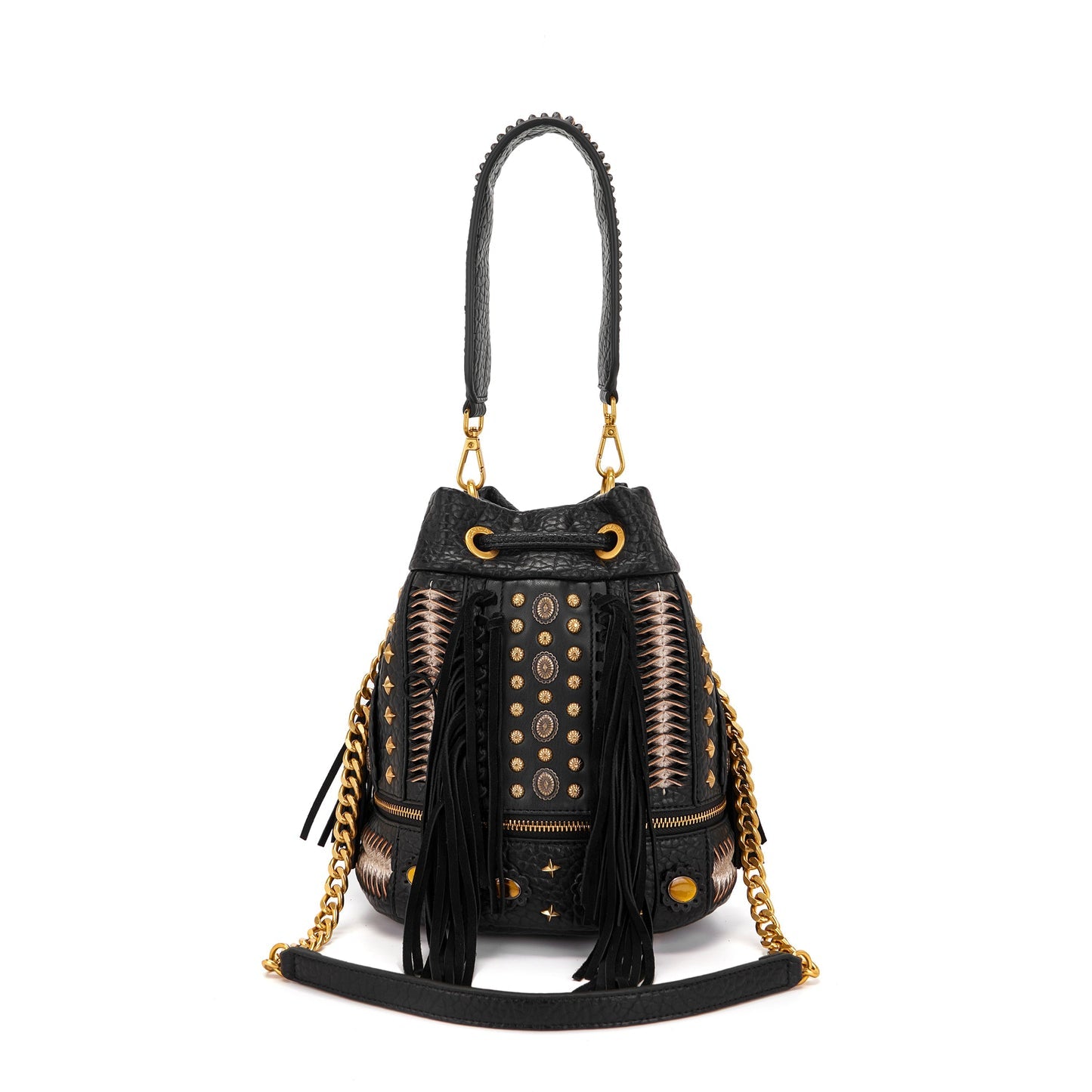 Secchiello in ecopelle effetto martellato con borchie in oro , tracolla catena e manico rimovibile.