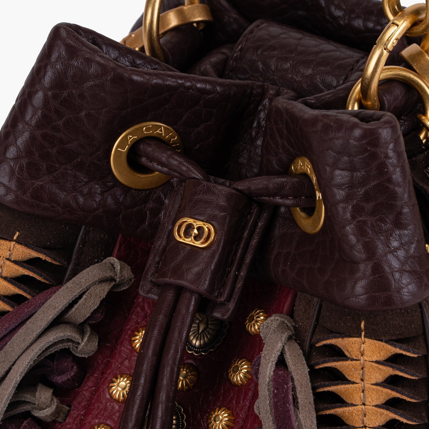 Secchiello in ecopelle effetto martellato con borchie in oro , tracolla catena e manico rimovibile.