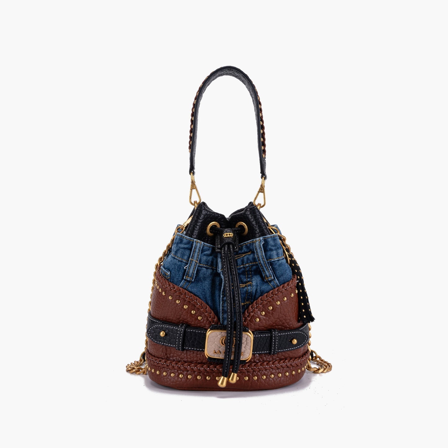 Secchiello multi materiale in jeans ed ecopelle martellata, con borchie dorate e manico e tracolla rimovibile.