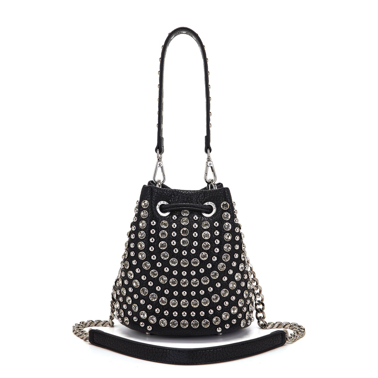 Secchiello in ecopelle con applicazioni di borchie e strass, manico e tracolla catena rimovibili.