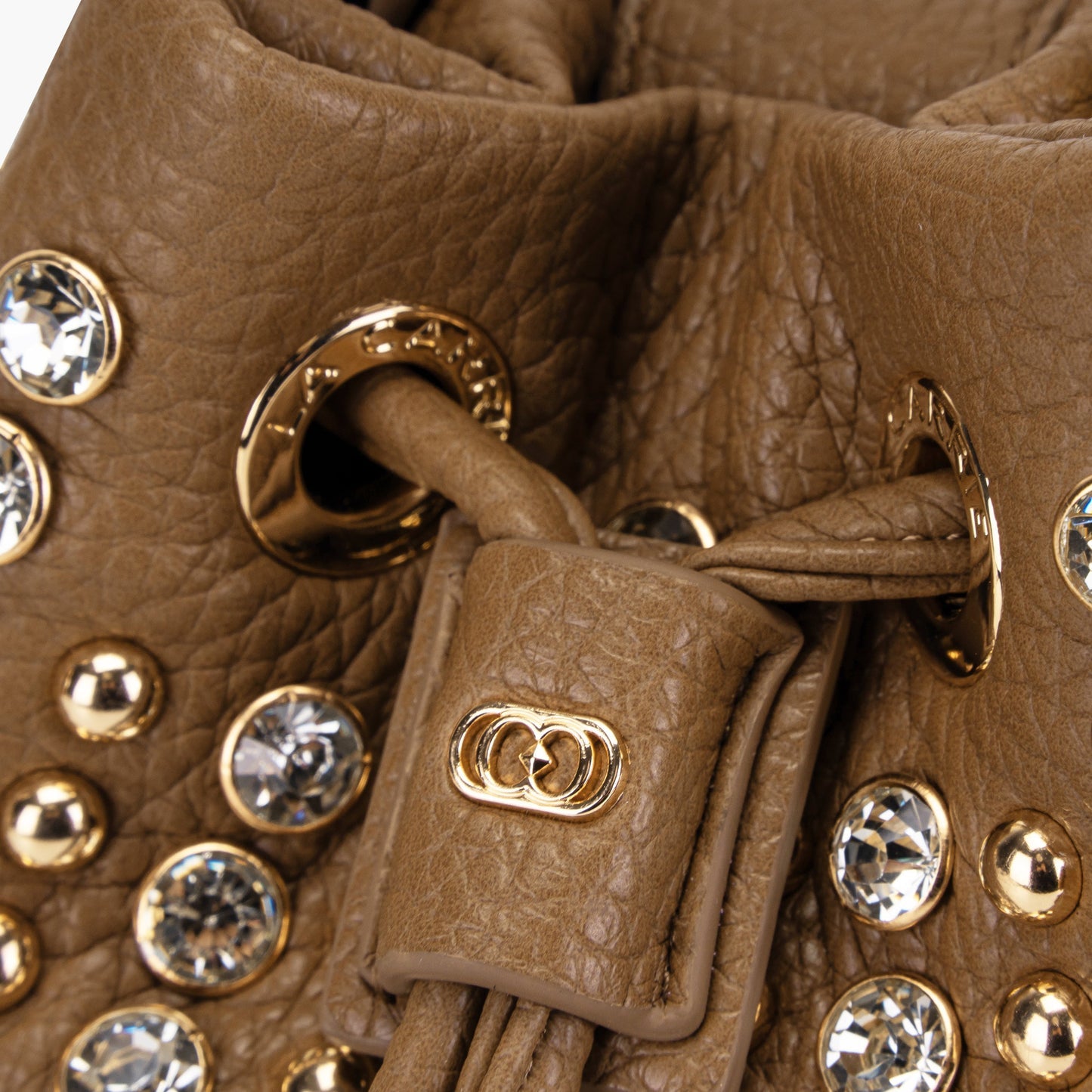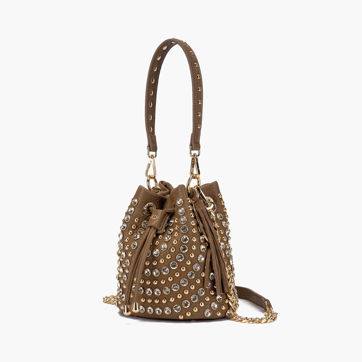 Secchiello in ecopelle con applicazioni di borchie e strass, manico e tracolla catena rimovibili.