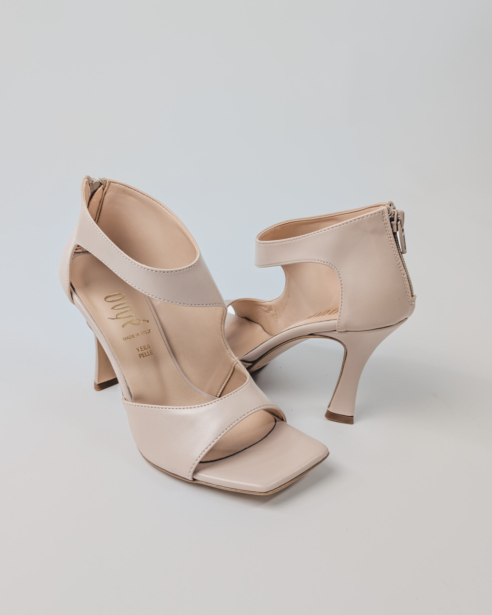 Sandalo in pelle di Ovyé con design asimmetrico, punta aperta e tacco di 9cm. Dotato di cerniera sul retro per una calzata semplice e sicura. Ideale per un look elegante e femminile, regalando comodità e stile.