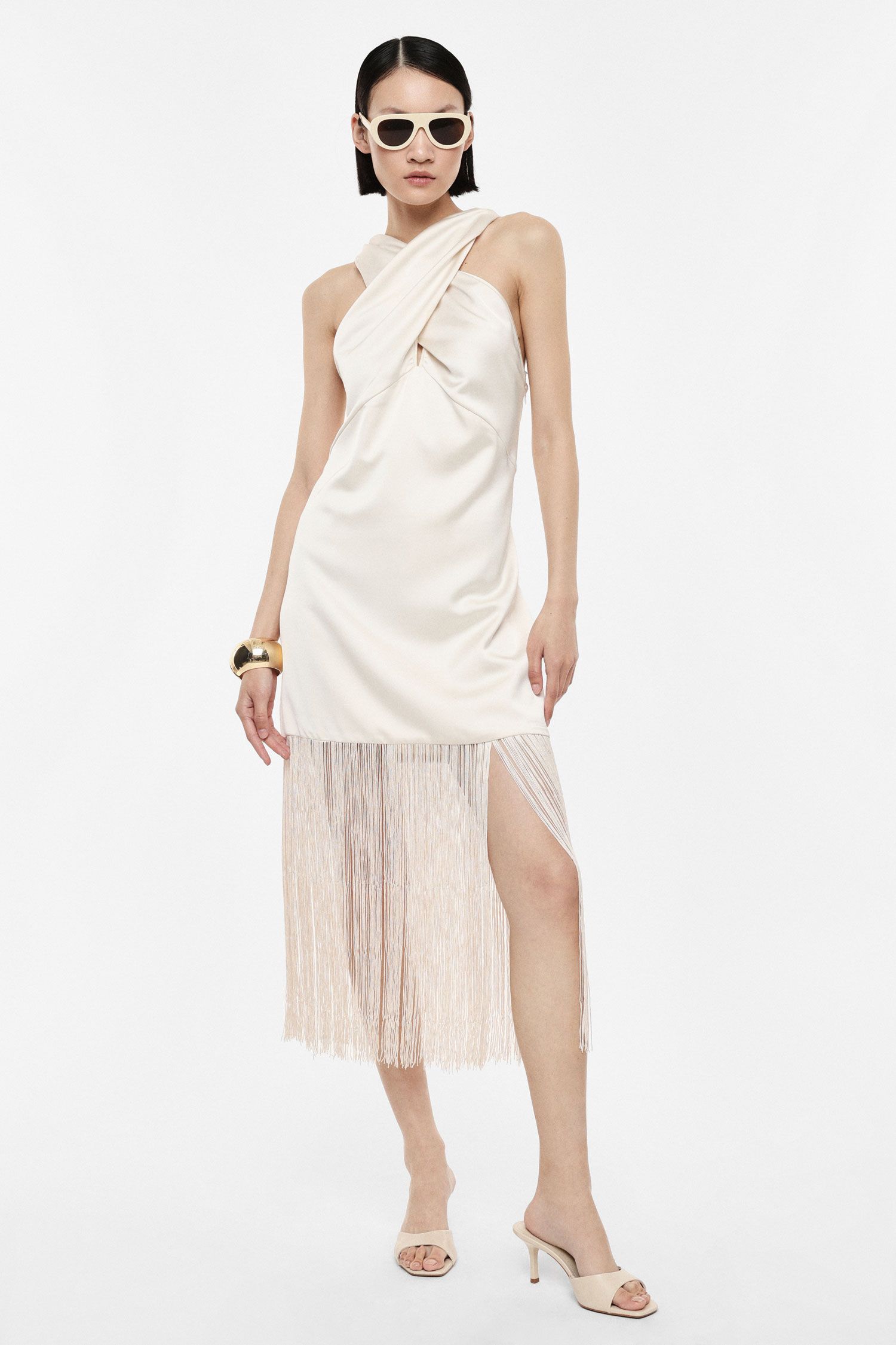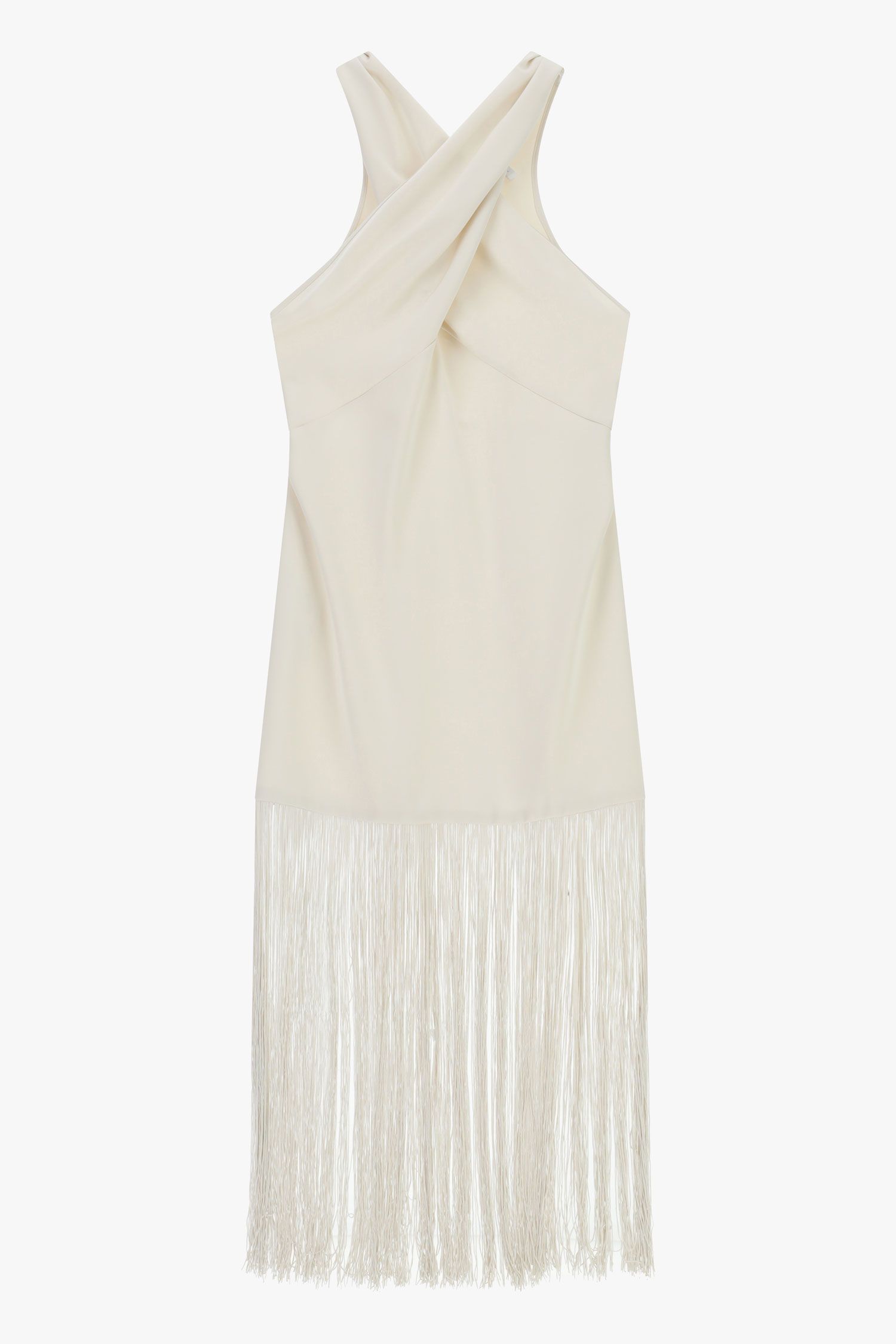 Abito lungo caratterizzato da uno scollo asimmetrico con spalline larghe incrociate e applicazione di frange al fondo. Un modello sofisticato che consente la massima libertà di movimento, ideale per creare combinazioni originali e rispondere alle esigenze di uno stile contemporaneo e personale.