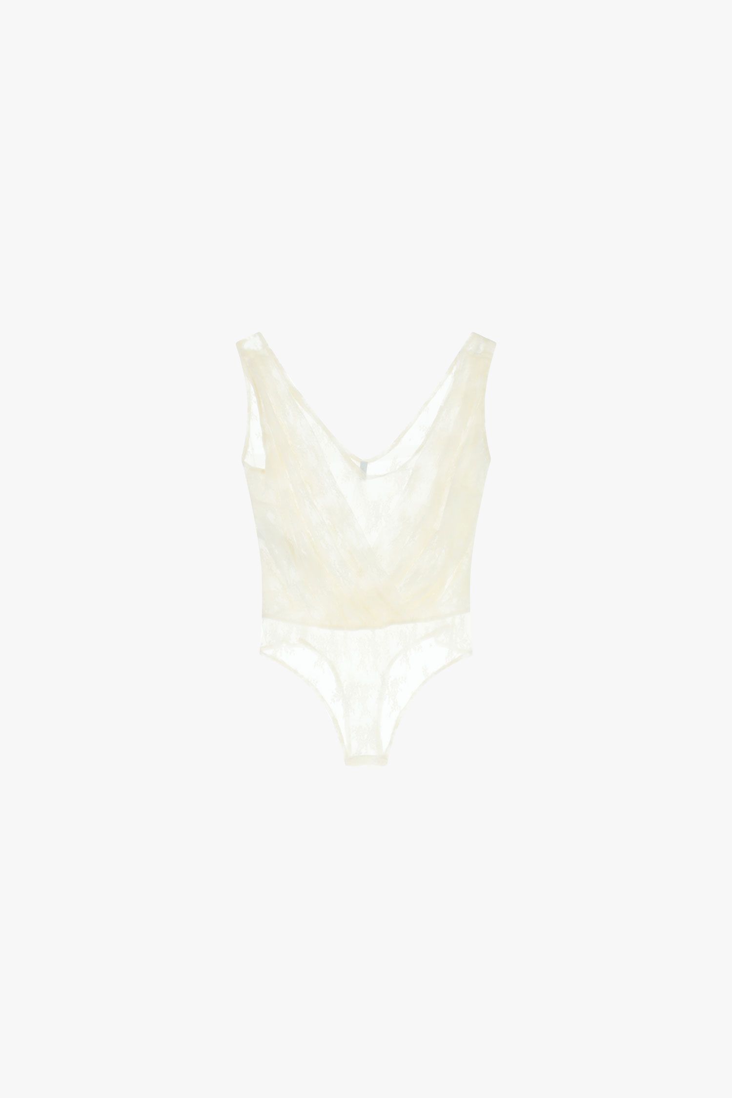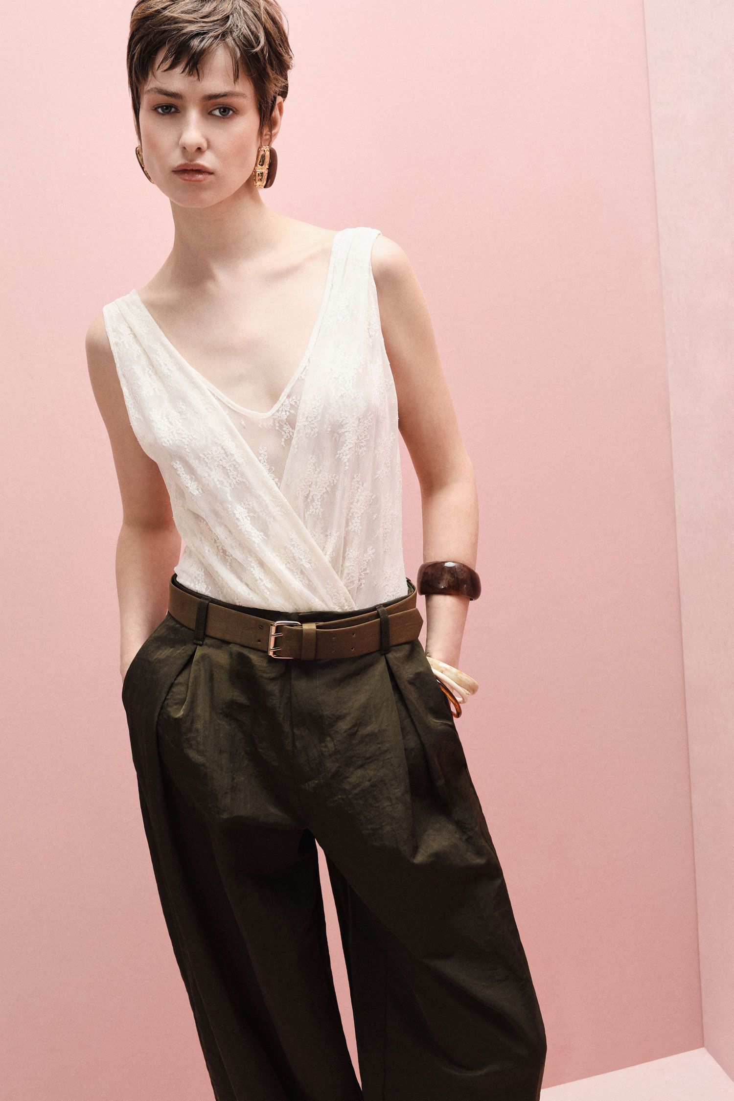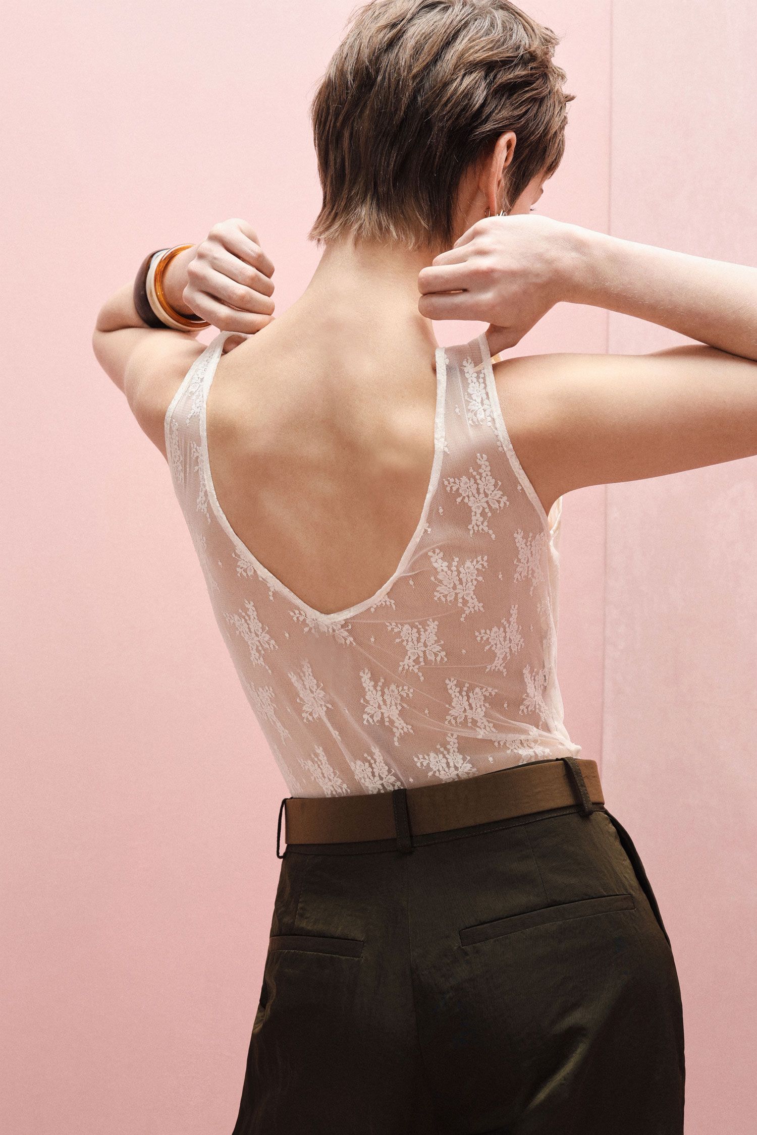 Body senza maniche dal taglio incrociato, caratterizzato da un profilo trasparente e stampa floreale in rilievo. Il design delinea una silhouette femminile e contemporanea, valorizzando ogni look metropolitano. Il profondo scollo a v aggiunge versatilità, permettendo abbinamenti creativi con blazer o pantaloni sartoriali.
