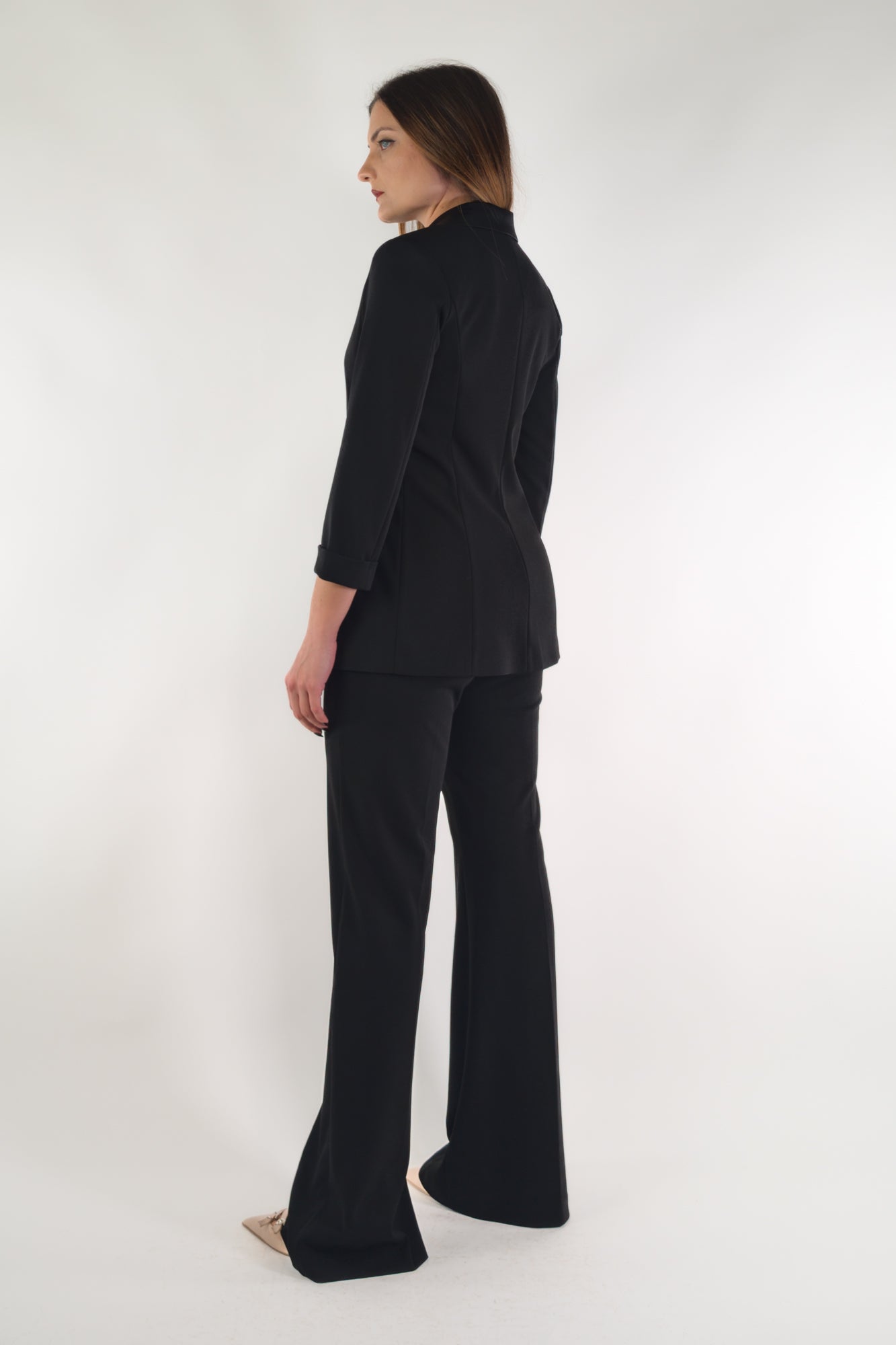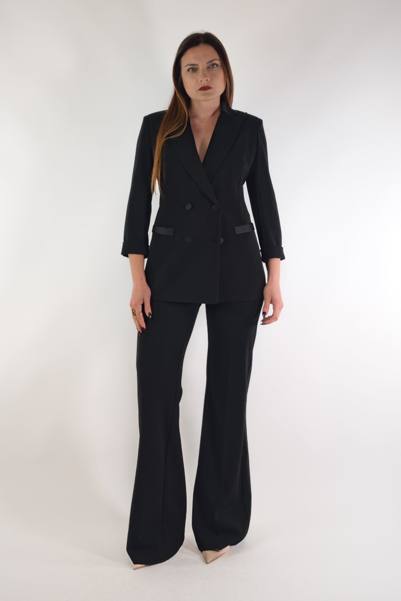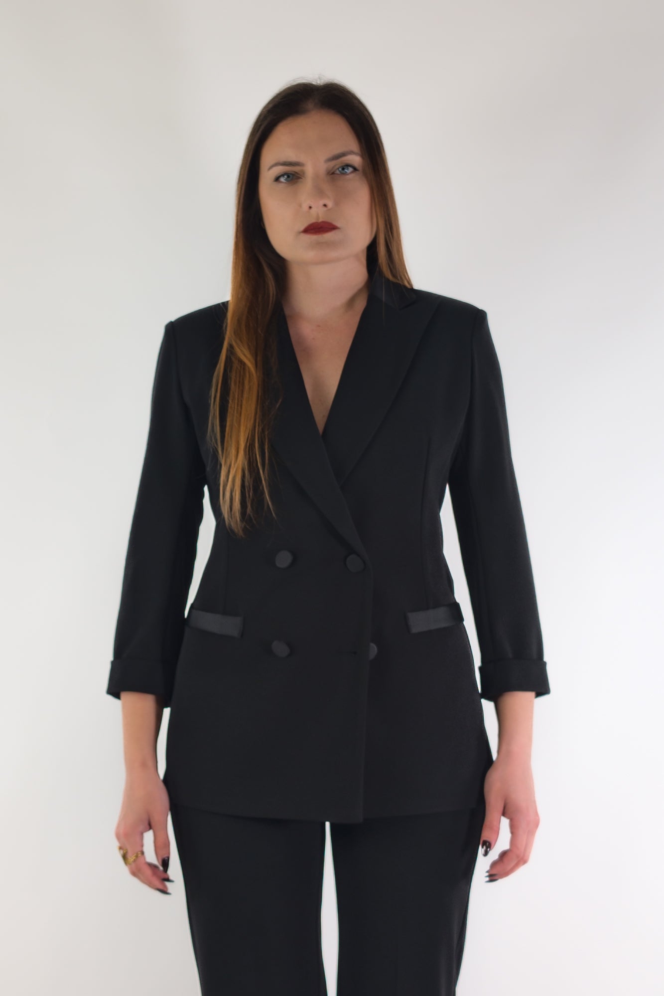 Giacca doppiopetto con revers e maniche a 3/4.