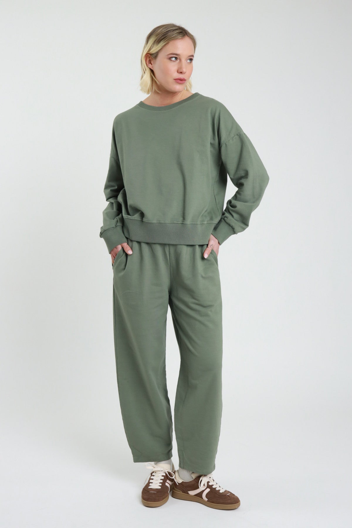 Completo in Felpa Elasticizzato Composto da Felpa Girocollo + Pantaloni Dritti sul Fondo, Tasche Laterali ed Elastico in Vita.