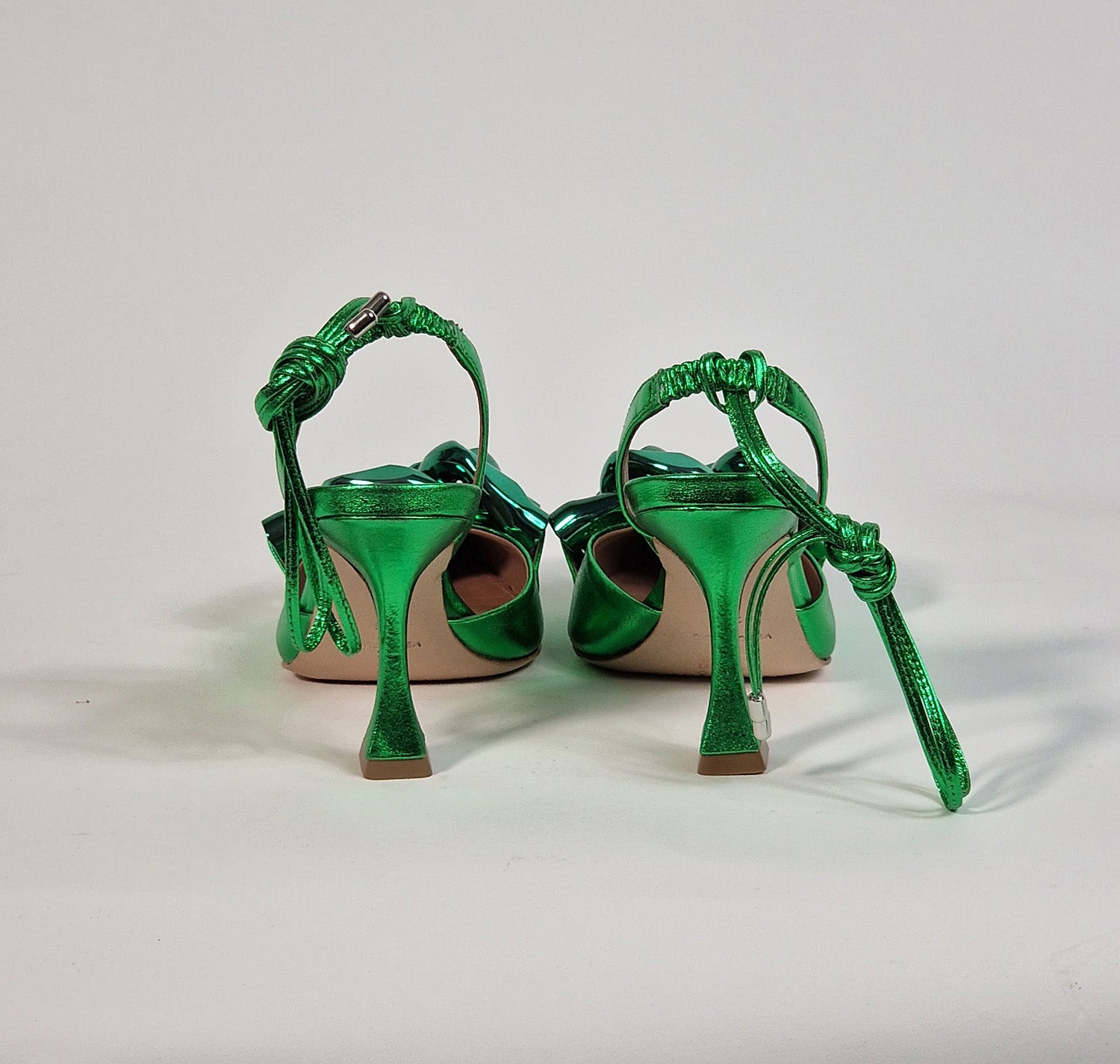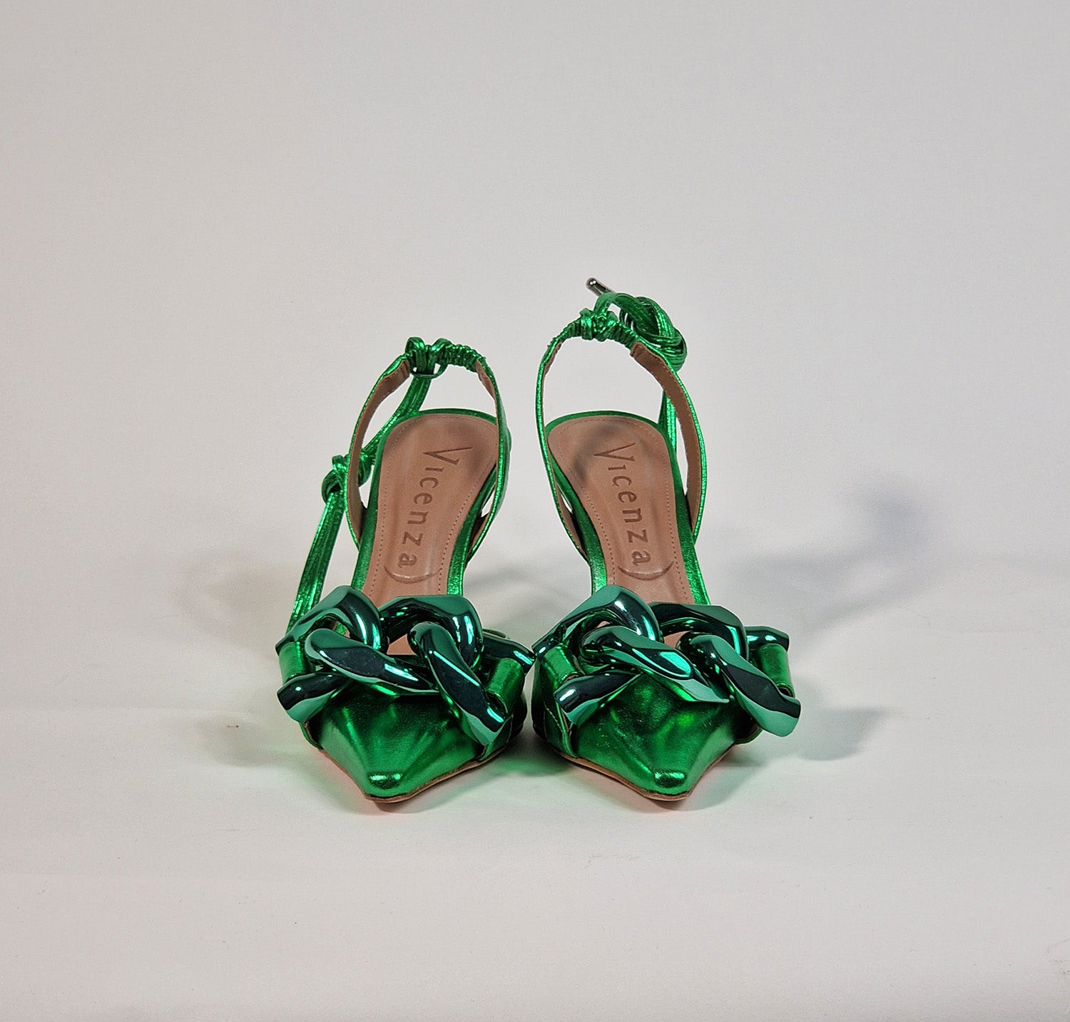 SS2023 VICENZA è una scarpa da donna realizzata in pelle laminata di colore Verde è dotata di accessorio maxi ed un tacco da 9 cm. Il fondo è in cuoio con sottopiede in pelle. Una scarpa perfetta per tutti gli stili ed occasioni.