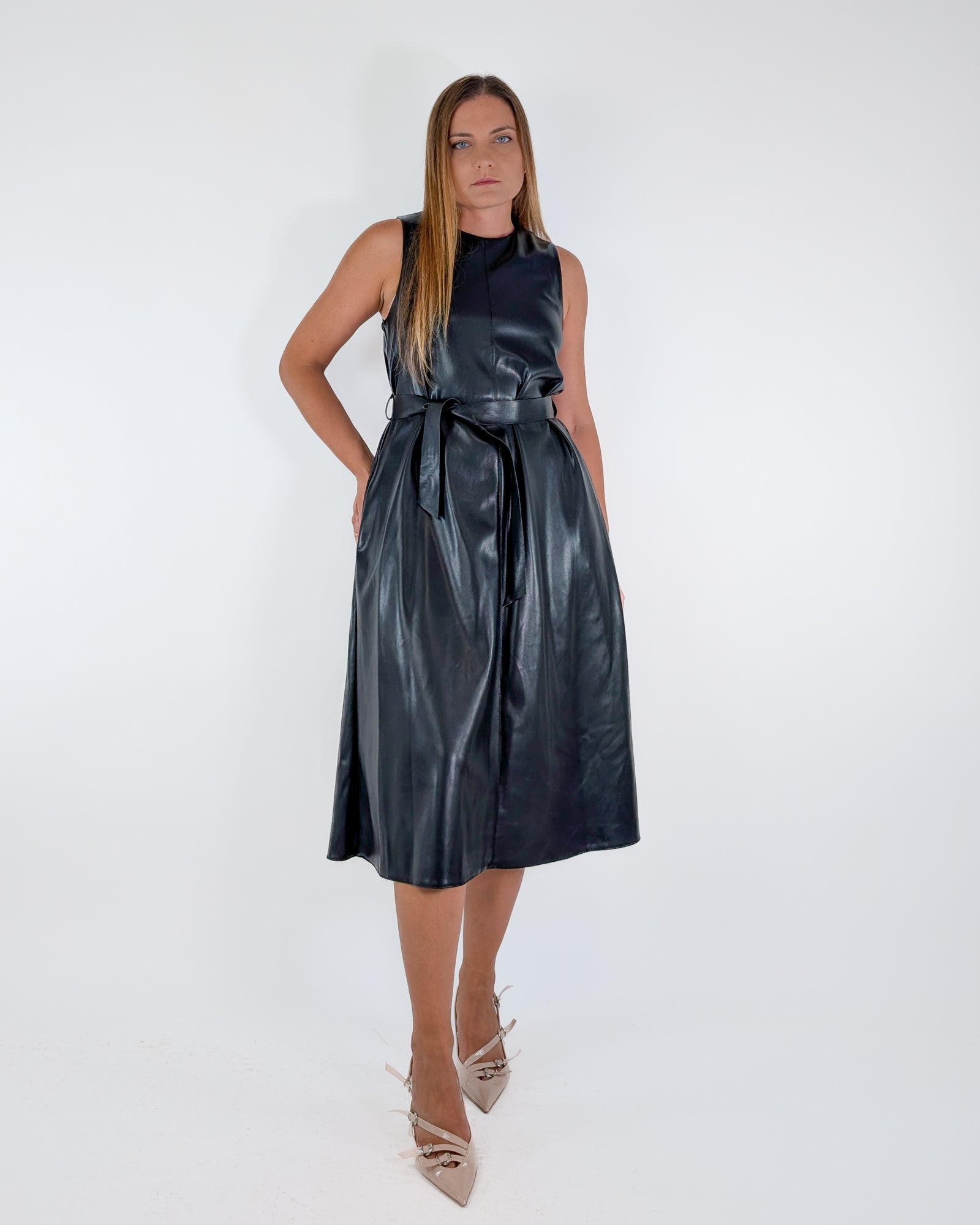 Abito in ecopelle morbidissima, con cintura. Chiusura con cerniera dietro la schiena.