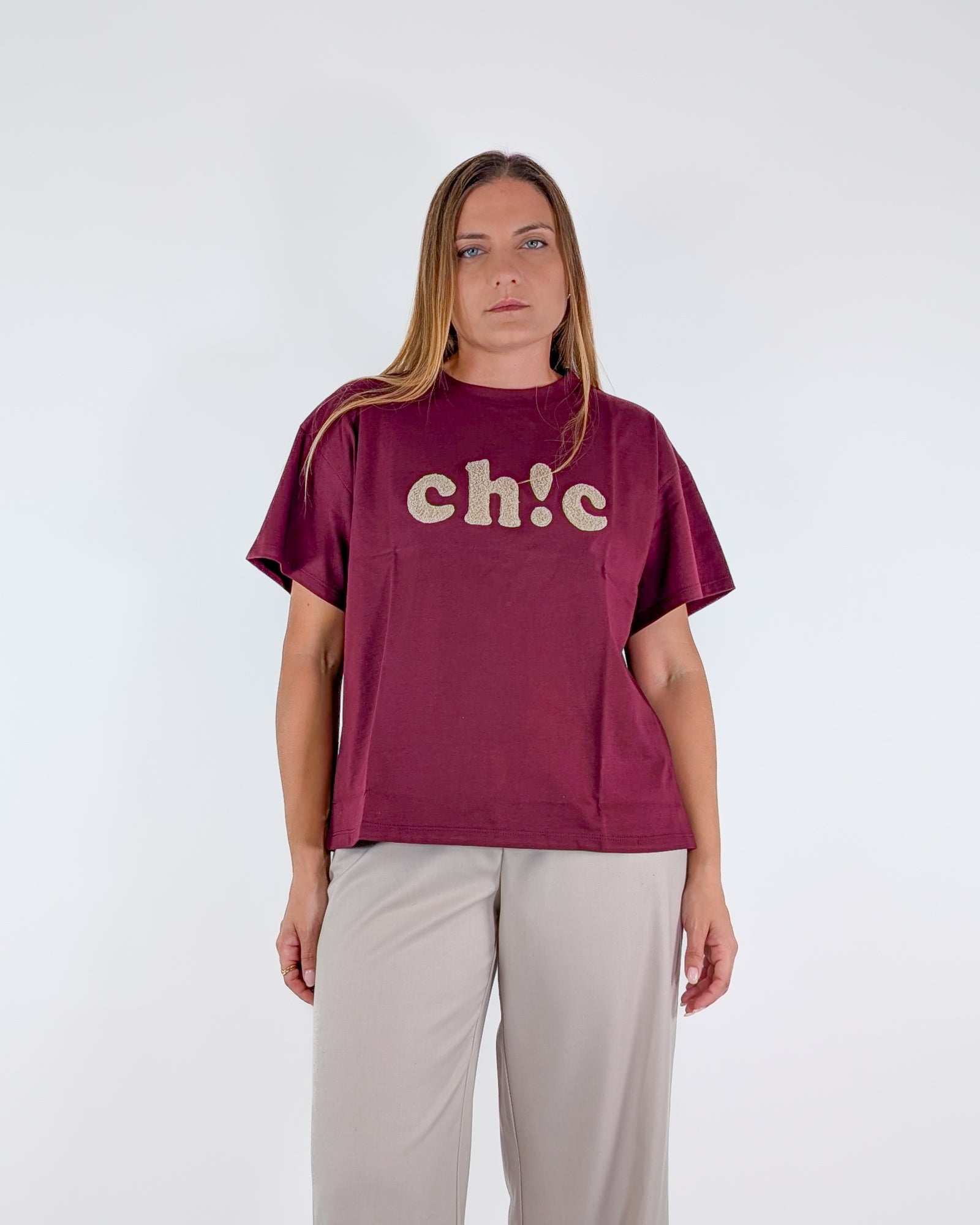 T-shirt Girocollo Maniche Corte con Scritta ''Ch!c'' in Boucle.