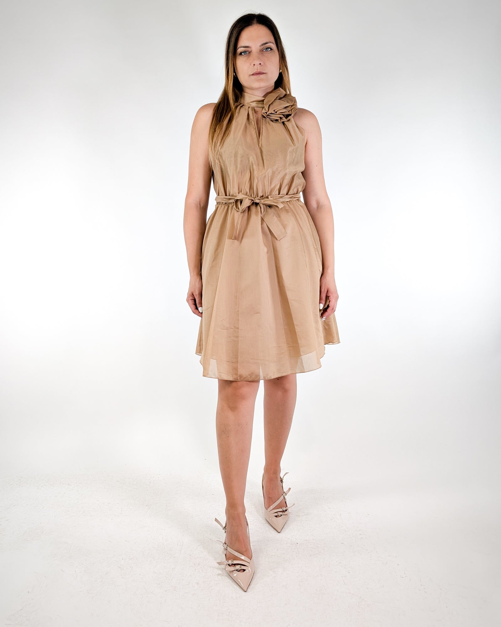 Abito leggero con fiocco e spilla.