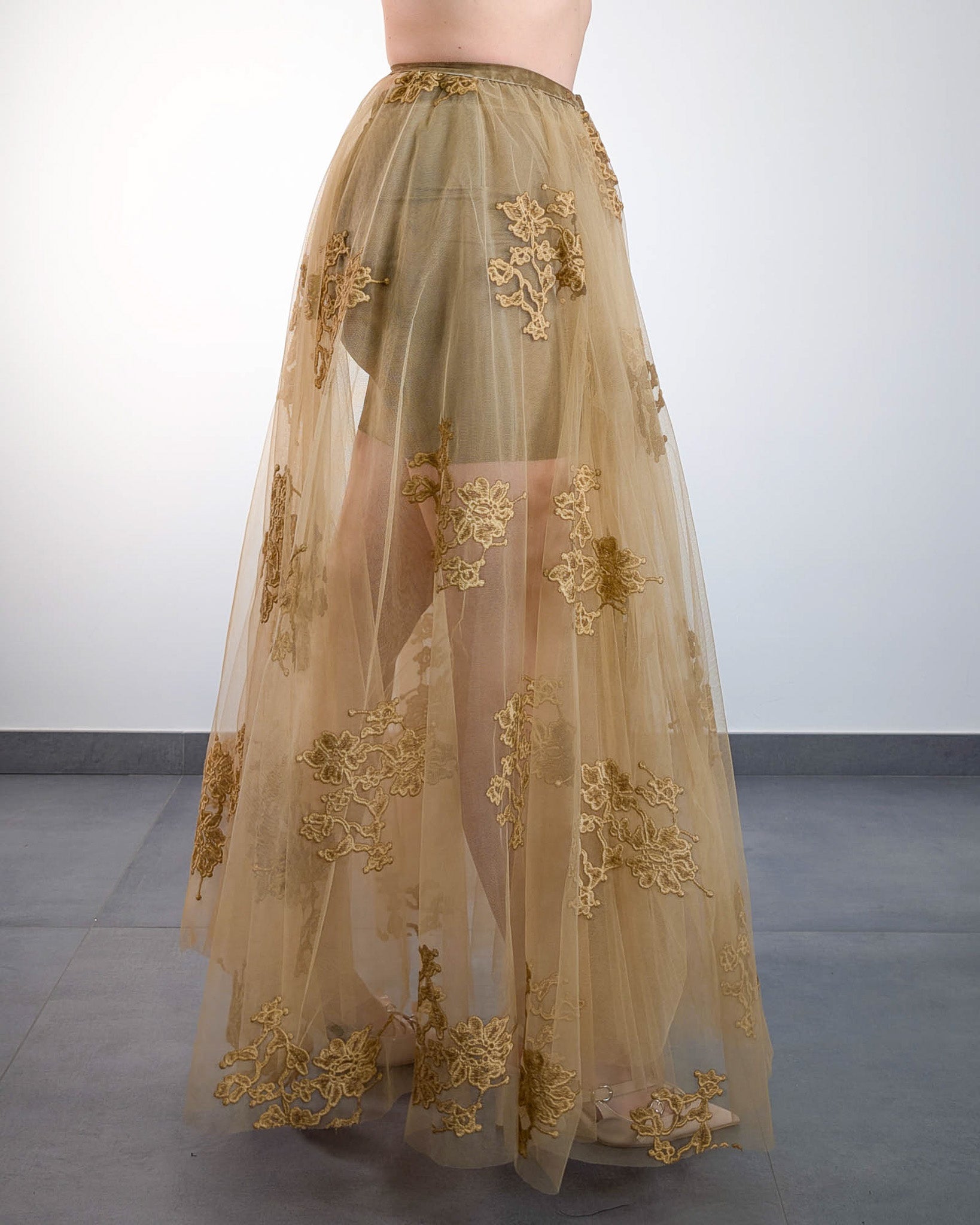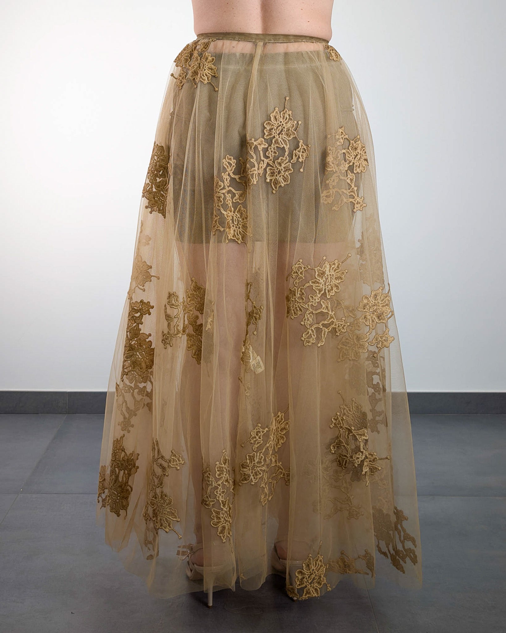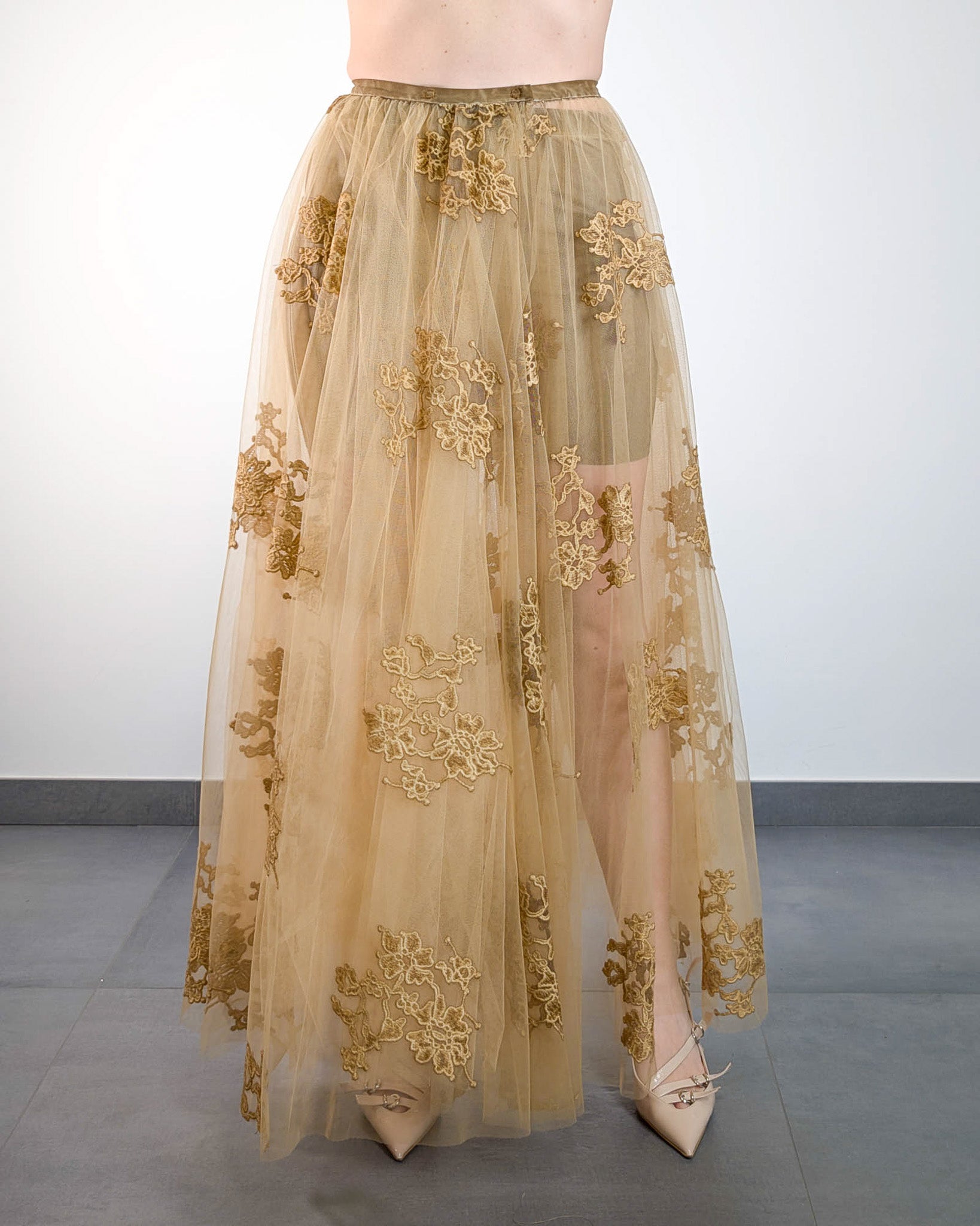 Gonna lunga in tulle ricamato con delicati motivi floreali in rilievo, leggera e romantica. Il tessuto trasparente lascia intravedere le gambe con eleganza, creando un gioco di contrasti raffinato. La vestibilità fluida valorizza la silhouette e rende questo capo perfetto per look da giorno o da cerimonia con un tocco sognante.