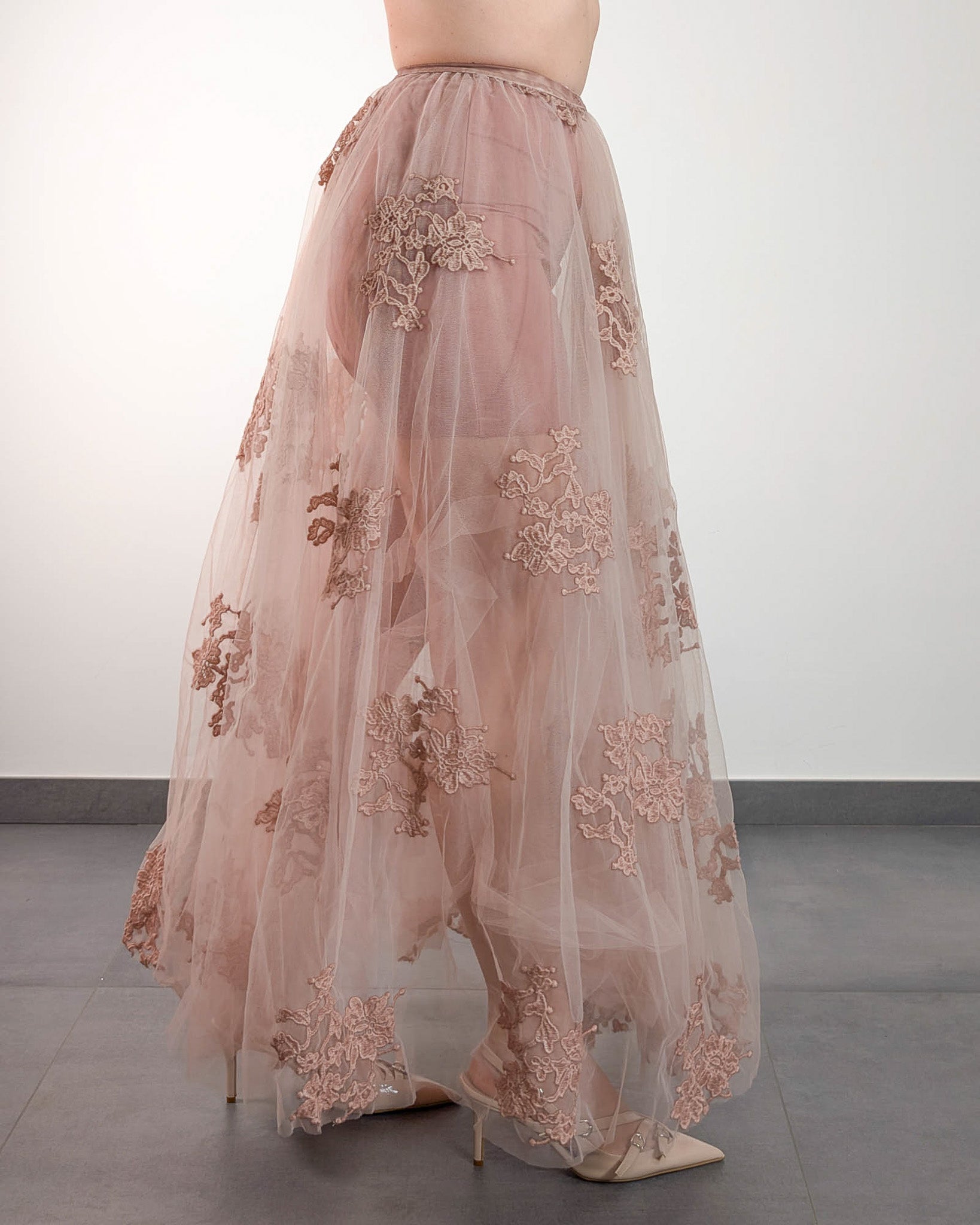 Gonna lunga in tulle ricamato con delicati motivi floreali in rilievo, leggera e romantica. Il tessuto trasparente lascia intravedere le gambe con eleganza, creando un gioco di contrasti raffinato. La vestibilità fluida valorizza la silhouette e rende questo capo perfetto per look da giorno o da cerimonia con un tocco sognante.