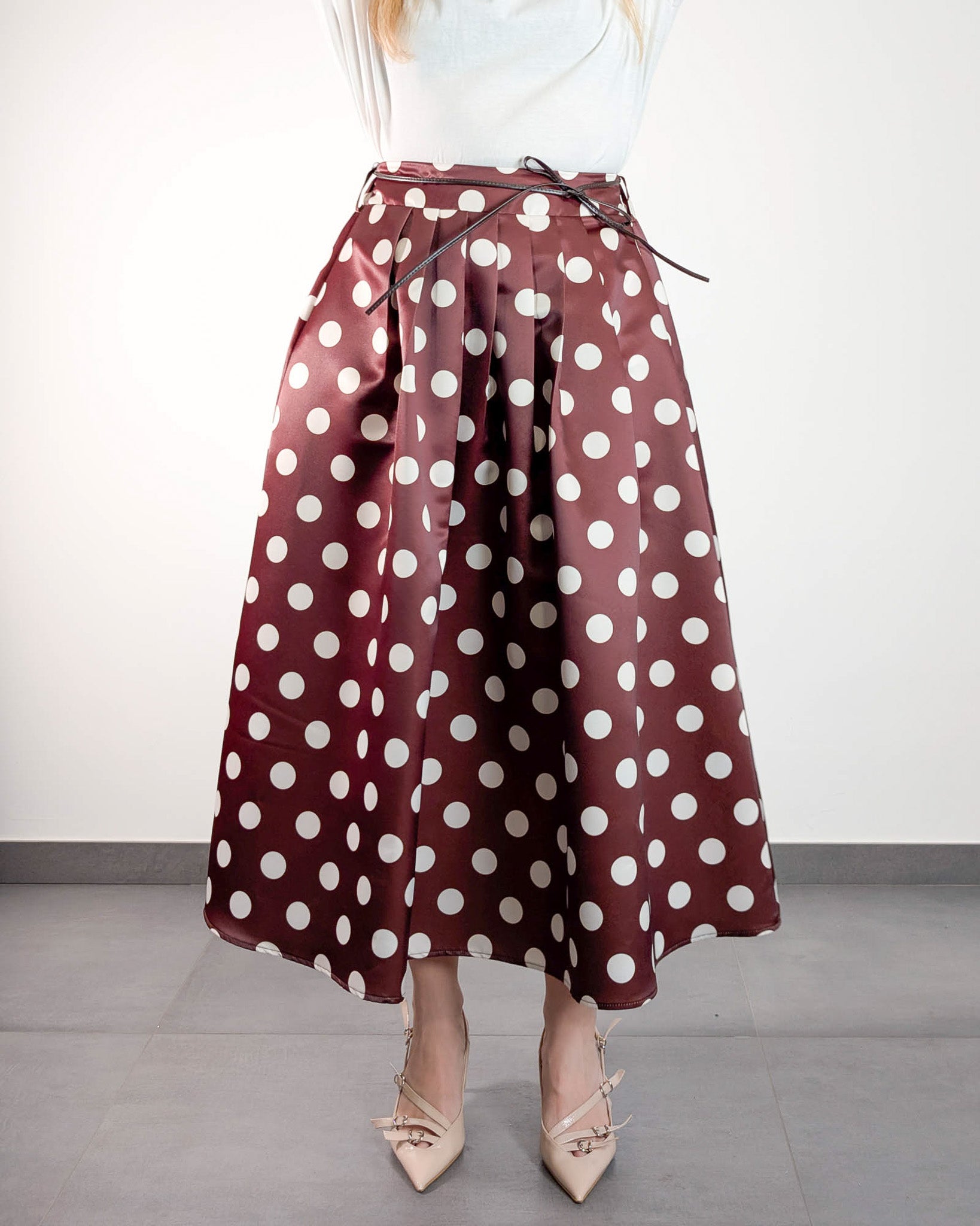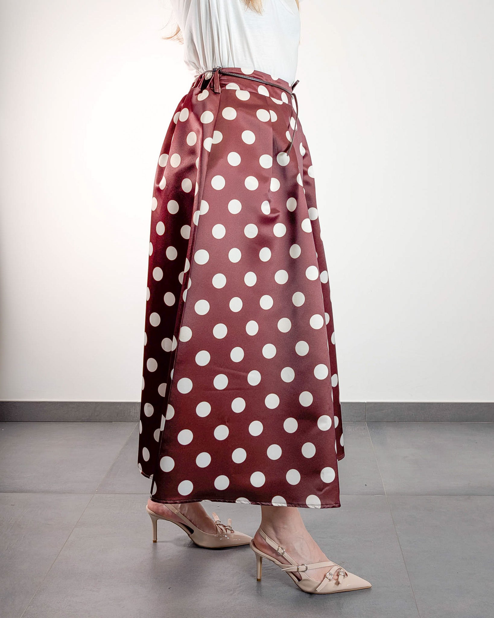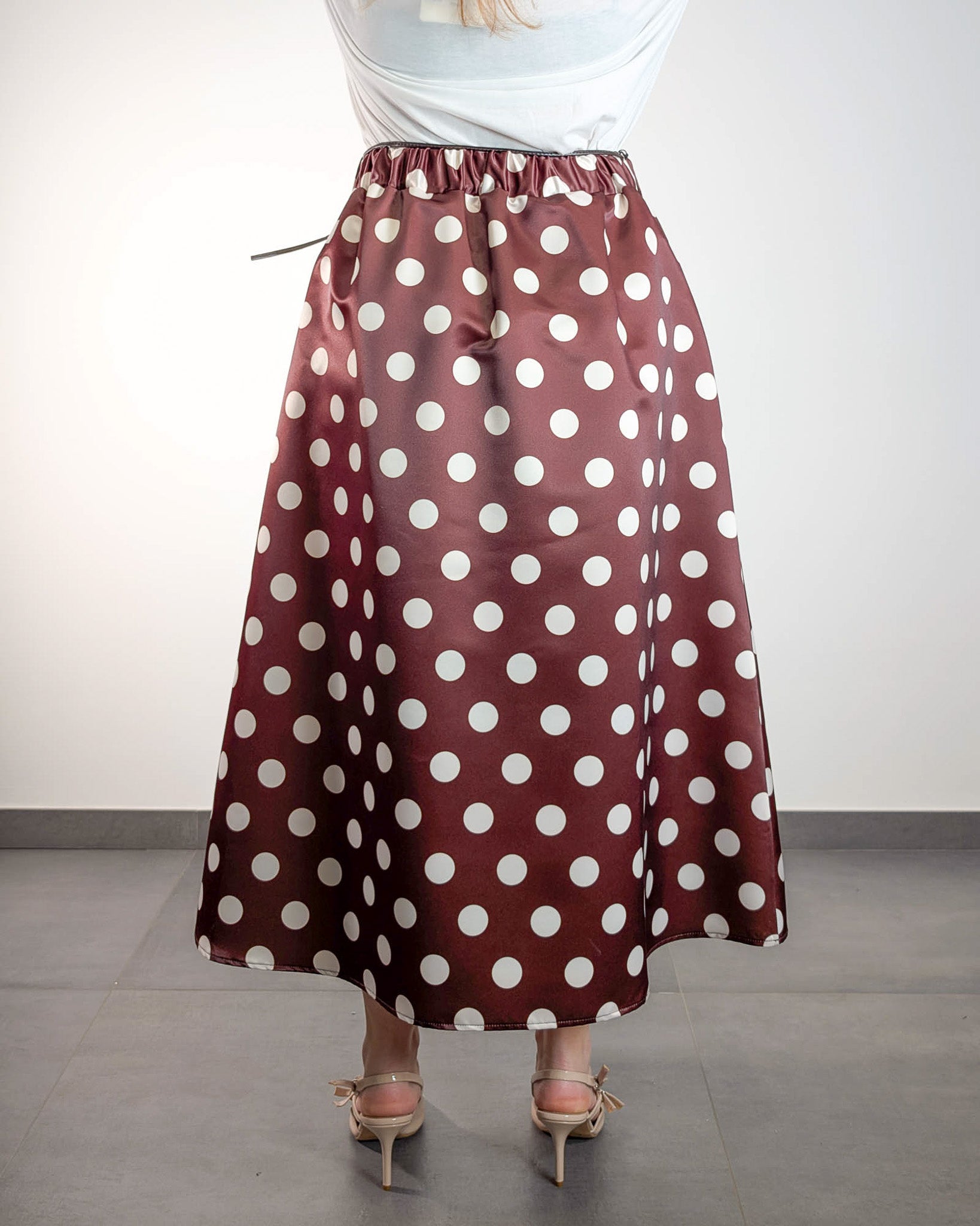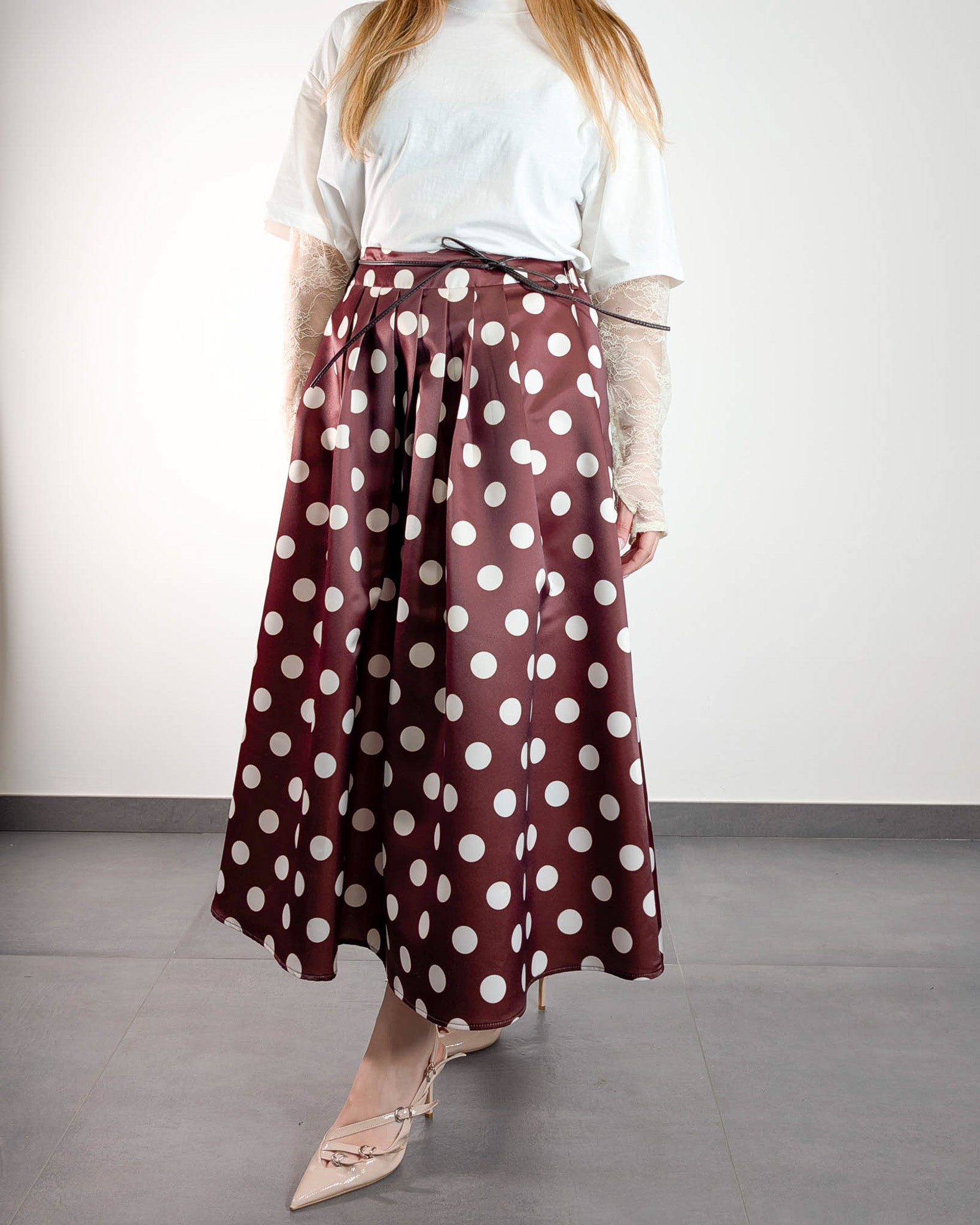 Gonna midi a ruota con vivace stampa a pois, perfetta per un look femminile dal fascino senza tempo. Il tessuto fluido con finitura leggermente lucida valorizza la silhouette e dona movimento. Il cinturino sottile in vita aggiunge un tocco elegante e definisce la figura.