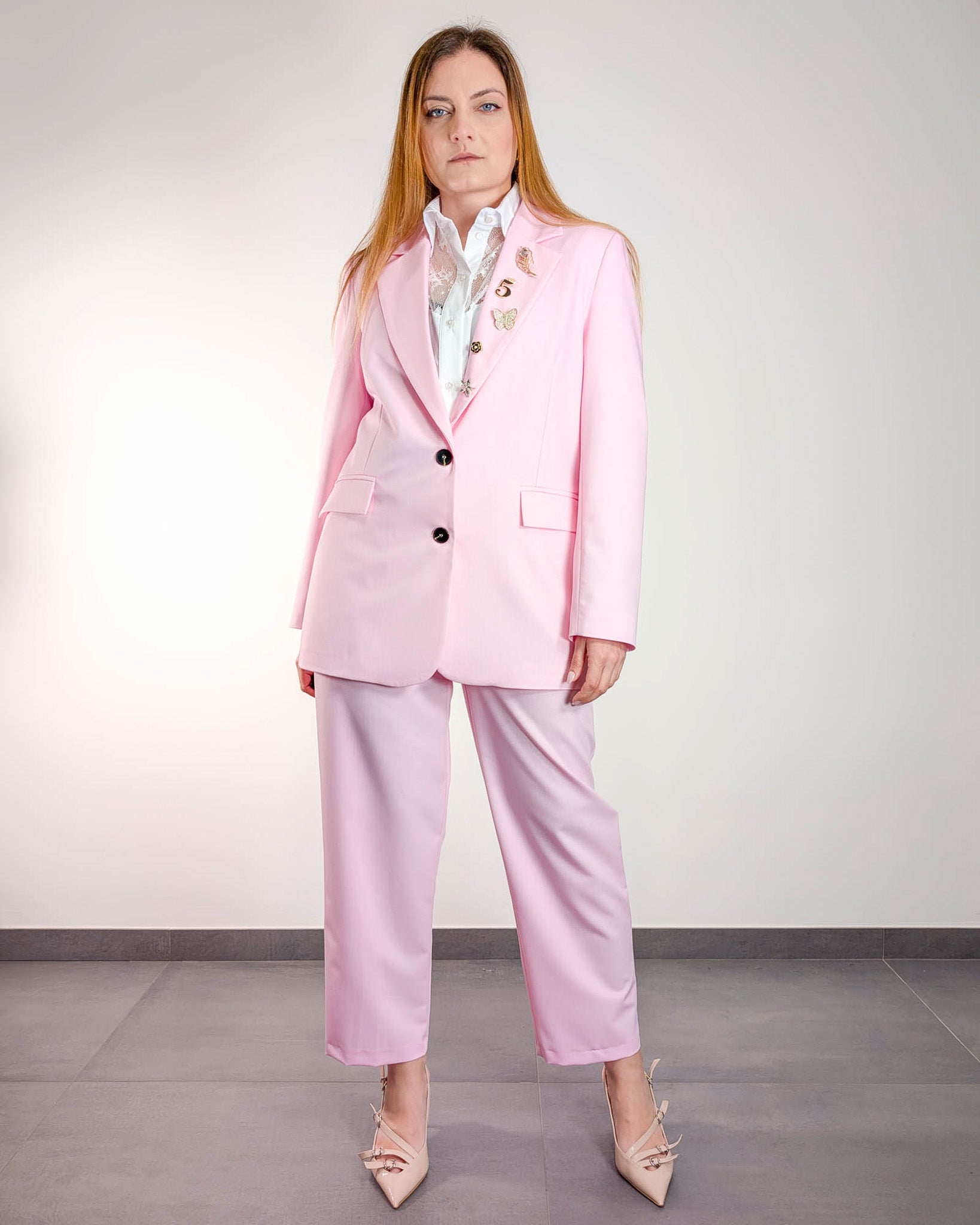 Sobrio nella linea, audace nel colore. Questo pantalone rosa a vita alta valorizza la silhouette con una vestibilità dritta e lineare, perfetta per look eleganti o casual. Da indossare con la giacca coordinata per un total look vibrante, oppure con una camicia bianca per un contrasto luminoso e raffinato.