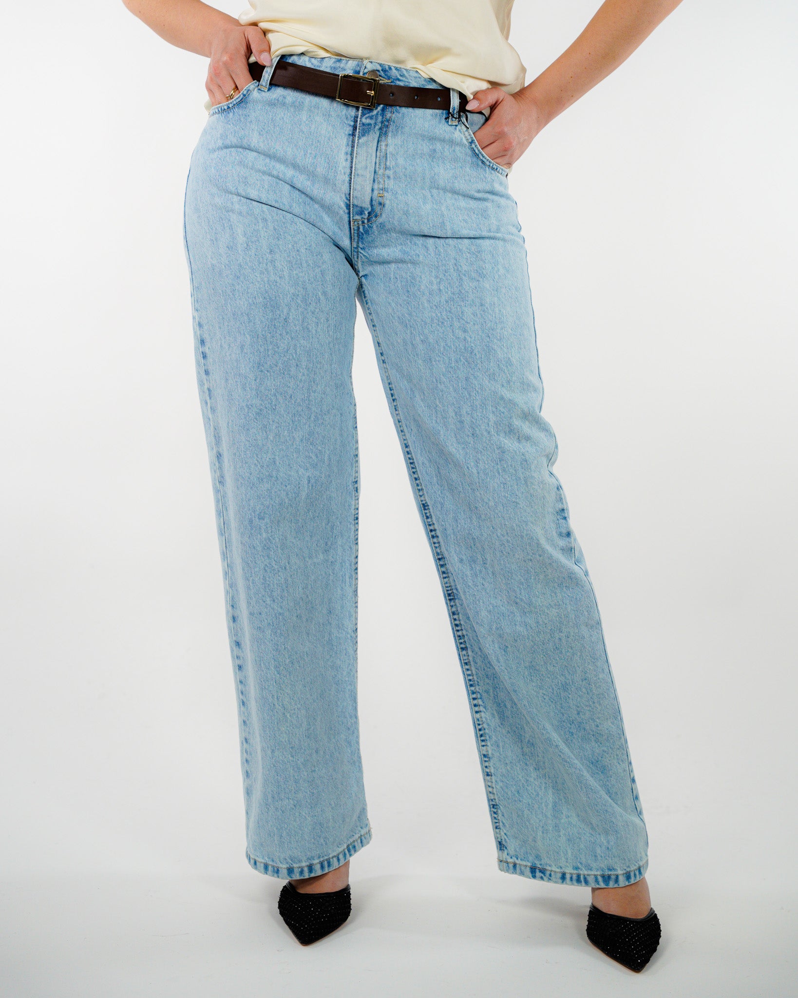 Jeans dritti a vita alta in denim chiaro, dal taglio morbido e lineare, perfetti per look casual o più curati con una camicia o un top in raso.