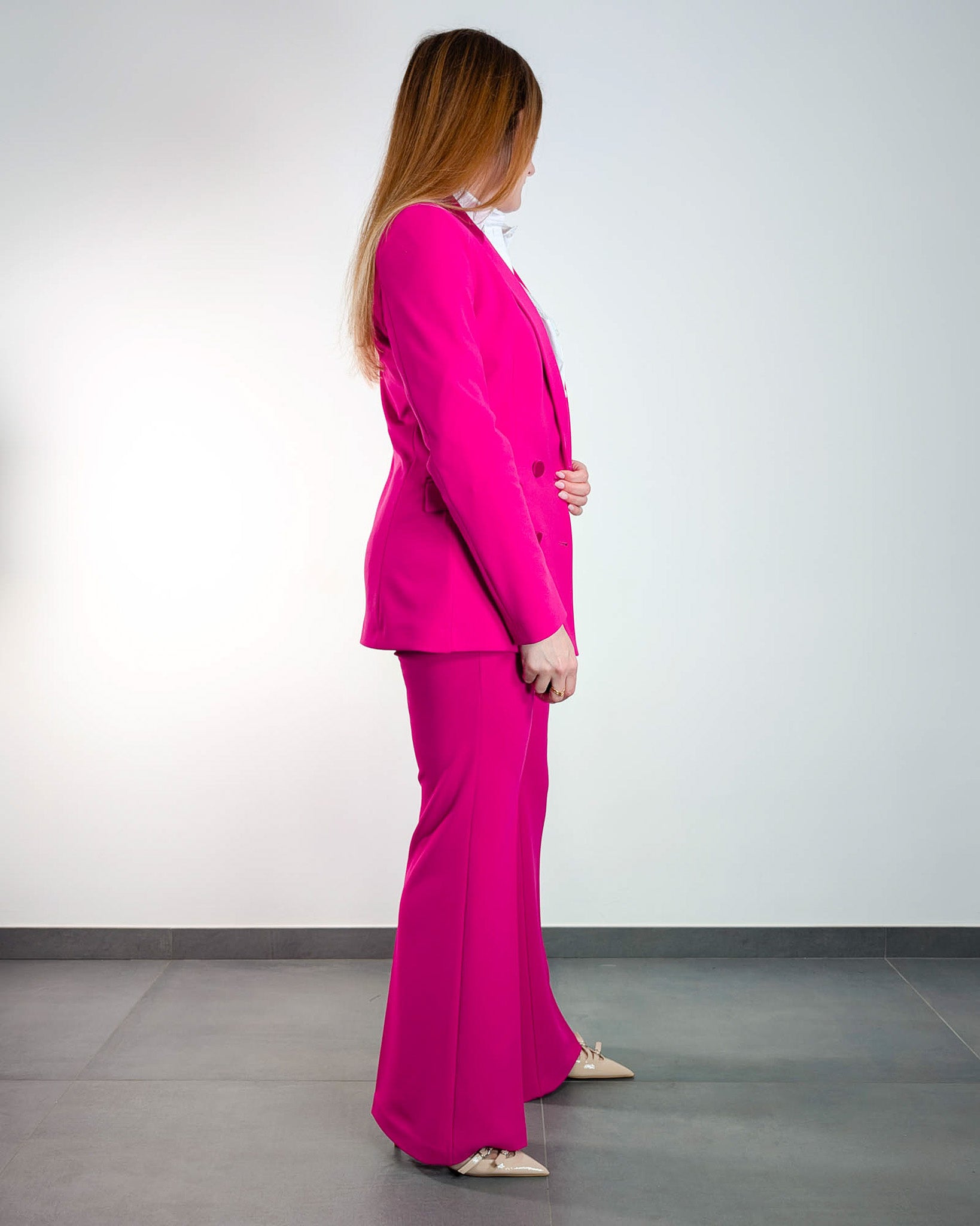 Giacca lunga in un vivace fucsia, dal taglio pulito e moderno. Chiusura doppiopetto tono su tono e spalle leggermente accentuate per un look audace e femminile. Perfetta per accendere l’outfit e trasmettere energia.
